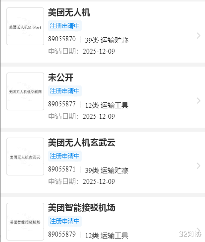 知协查询了解到,美团关联公司北京三快科技有限公司在发布新项目之前,已提前申请注册多枚“美团无人机M-DaaS”“美团智能接驳机场”“美团无人机玄武云”“美团无人机云枢”“美团无人机低空航网”等商标,国际分类包括运输工具、运输贮藏等,当前商标状态均为等待实质审查。