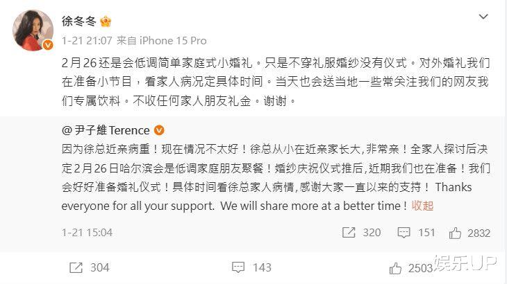 大家还记得以好身材著称的演员徐冬冬吗?她原本计划在2月26日于家乡哈尔滨举办盛大婚礼,和比她大15岁的演员尹子维完成人生大事。然而就在1月21日,这对情侣通过社交媒体突然宣布:婚礼计划有变!