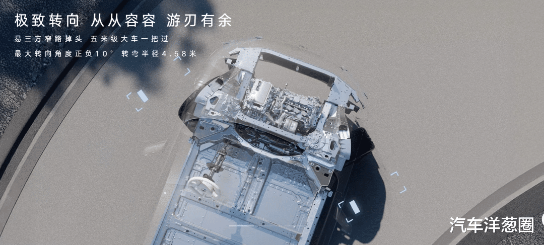 基于三电机系统的易三方,已经是腾势品牌的招牌技术,如今在腾势N8L上实现标配,与之配套的还有后轮转向,可以明显提升低速的操控灵活性和高速稳定性,也可以进行坦克掉头这种炫技型操作。