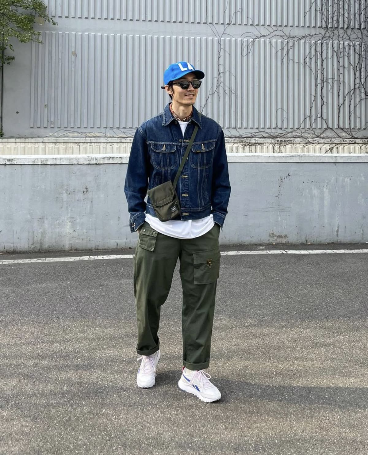 在春季,经典的洗水蓝色和军绿色的工装裤就是很完美的组合,这种搭配不但不挑人,而且非常的耐看。