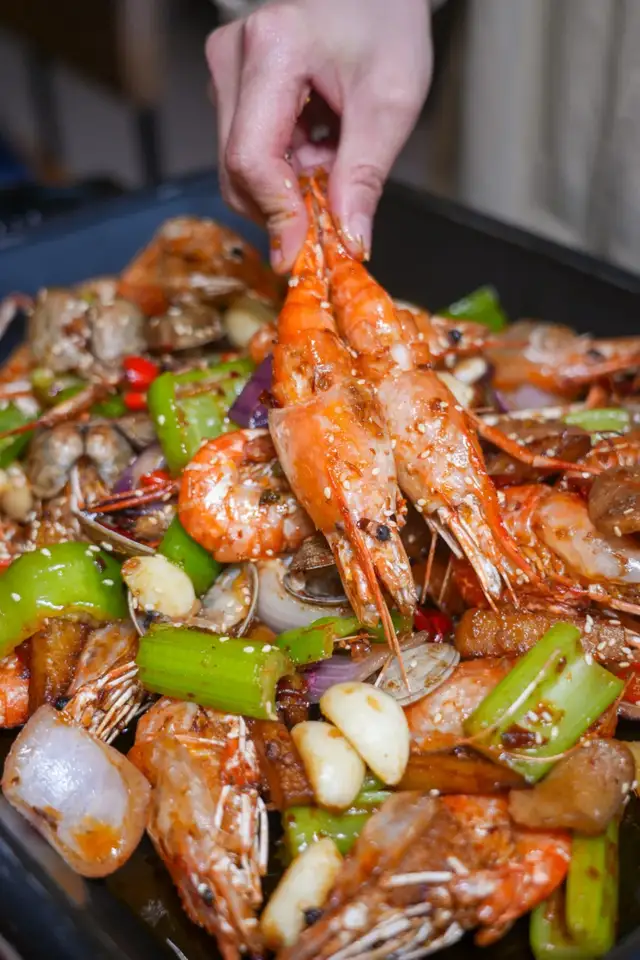 重油、香料、啤酒焖烧。一锅出来,红亮油润!味道是往里走的,不是浮在表面的辣。虾肉是软弹的,带着香料渗进去的那种层次感。