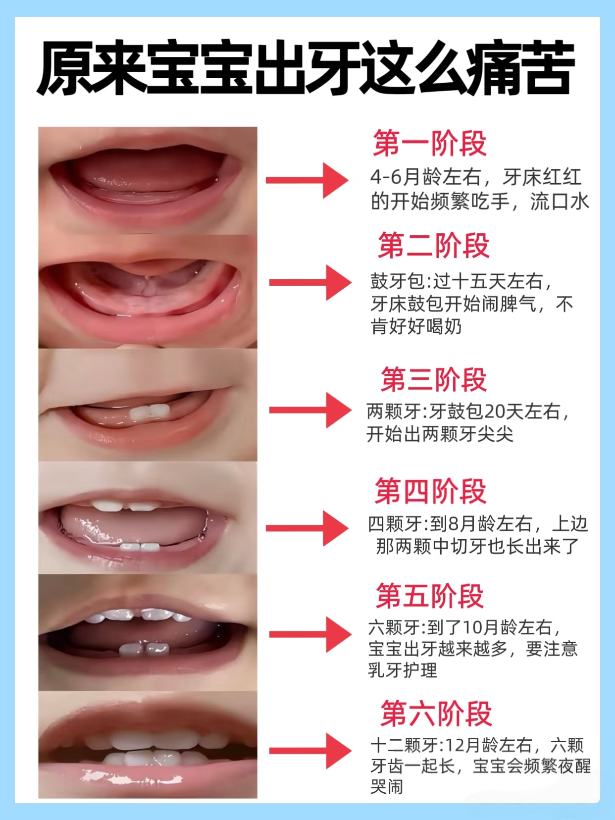 如果宝宝同时出现了上面好几条,那基本可以确定,是那颗萌萌的小乳牙在努力“破土”了。