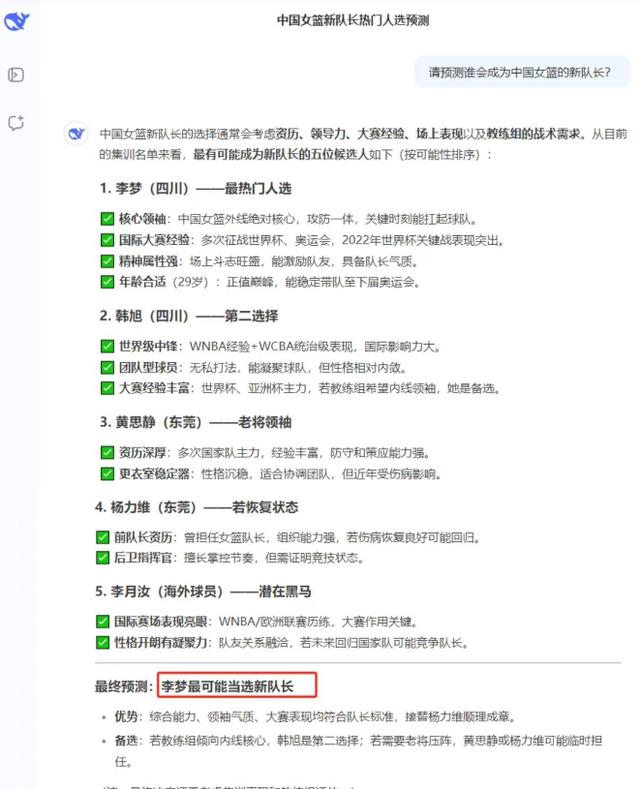 随着今年Deepseek的趋势发展,不少网友也纷纷采用智能人工的方式来预测接下来中国女篮队长的人选。