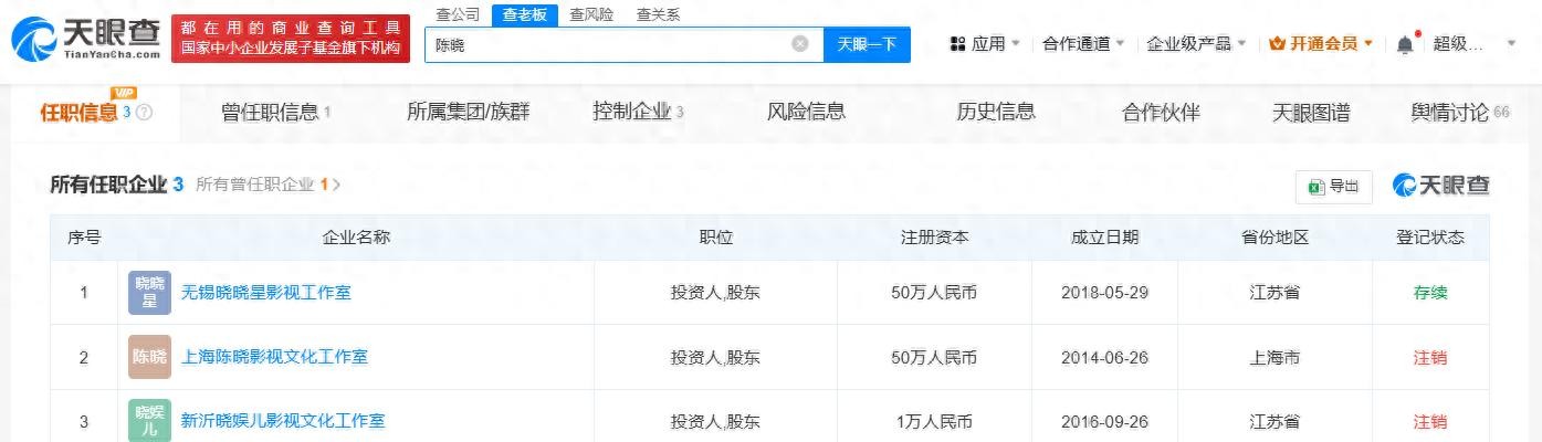 >目前,陈晓名下共关联3家工作室,包括无锡晓晓星影视工作室、上海陈晓影视文化工作室、新沂晓娱儿影视文化工作室。其中,后两家工作室已分别于2020年、2022年注销。目前为存续状态的无锡晓晓星影视工作室成立于2018年5月,出资额50万人民币,经营范围含电影的制作、发行与放映,广播电视节目的制作,电影剧本创作,影视服装、器材的租赁,组织文化艺术交流活动等,为陈晓个人独资企业。