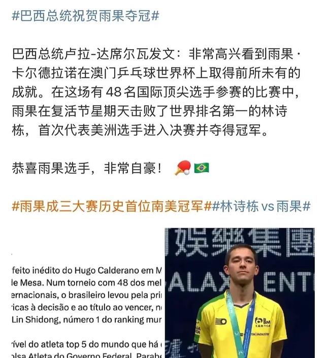 巴西总统卢拉发文,说他对雨果的夺冠感到非常自豪。