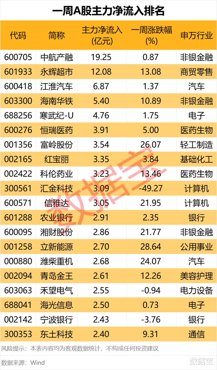 个股方面,除去上市新股,本周81股主力净流入逾1亿元。中航产融、永辉超市、江淮汽车、海南华铁净流入额排名前四,金额均在5亿元以上。中航产融和永辉超市净流入额超过10亿元,依次为19.25亿元、12.08亿元。