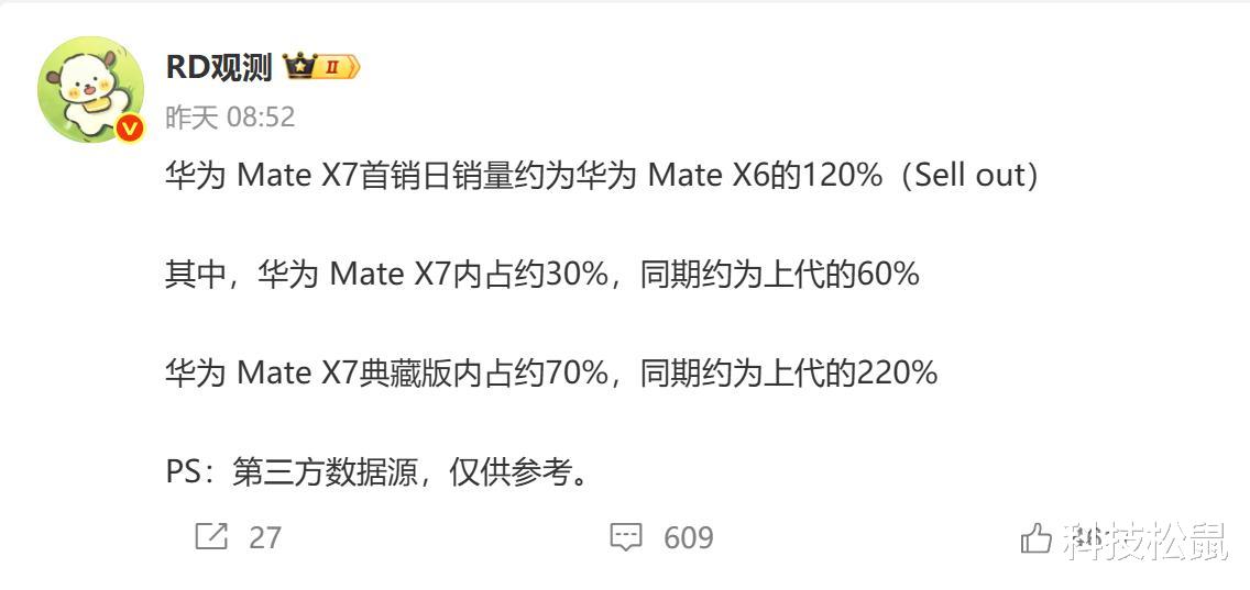 根据博主“RD观测”提供的数据,mate X7系列首销当天的销量约为上一代mate X6系列的120%,其中Mate X7约占全系总销量的30%,约为上一代的60%,mate X7典藏版占比高达70%,约为上一代的220%。华为mate X7系列对上一代实现了20%的大涨,更为重要的典藏版销量实现了120%的大涨,就是说价格更贵的典藏版首销当日实现了销量翻倍。