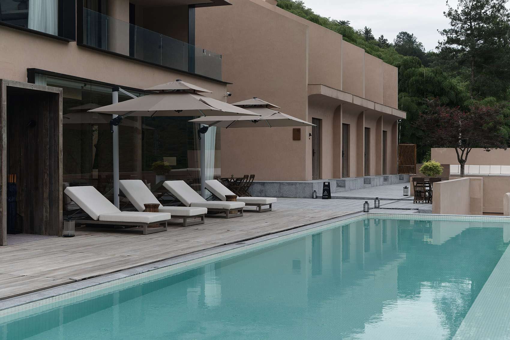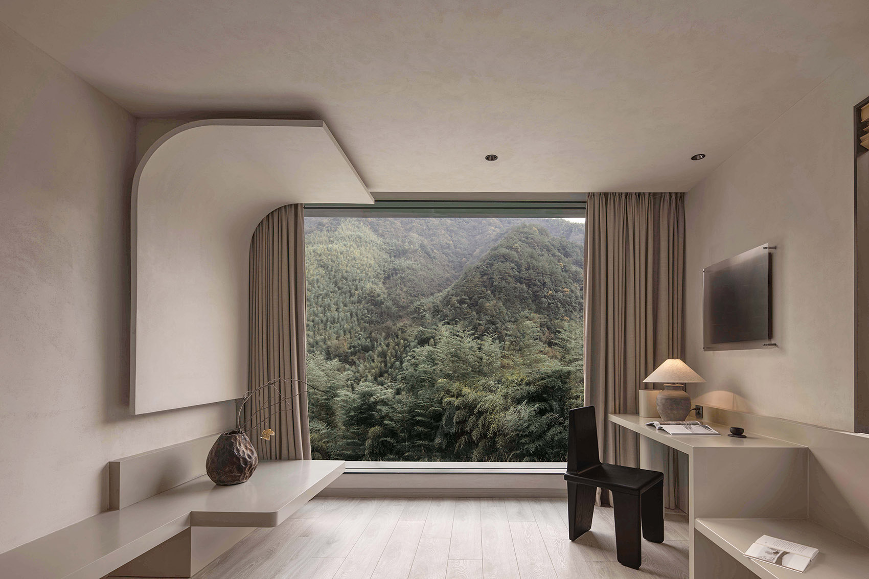 客房分别散布于三栋老房子中,主理人分别将其命名为「需」、「颐」、「赤」,每一间都淋漓尽致地展现了建筑与自然的完美结合。在无界的视觉效果下,一把躺椅,一本书,一杯茶,将窗外绿意盎然的山景与屋内肆意跃动的光影尽收眼底,这里便是消磨悠闲时光的好去处。