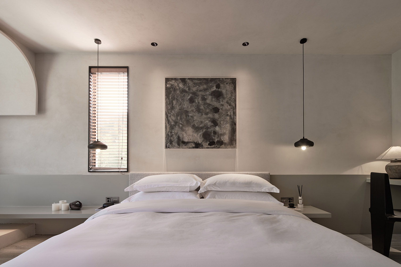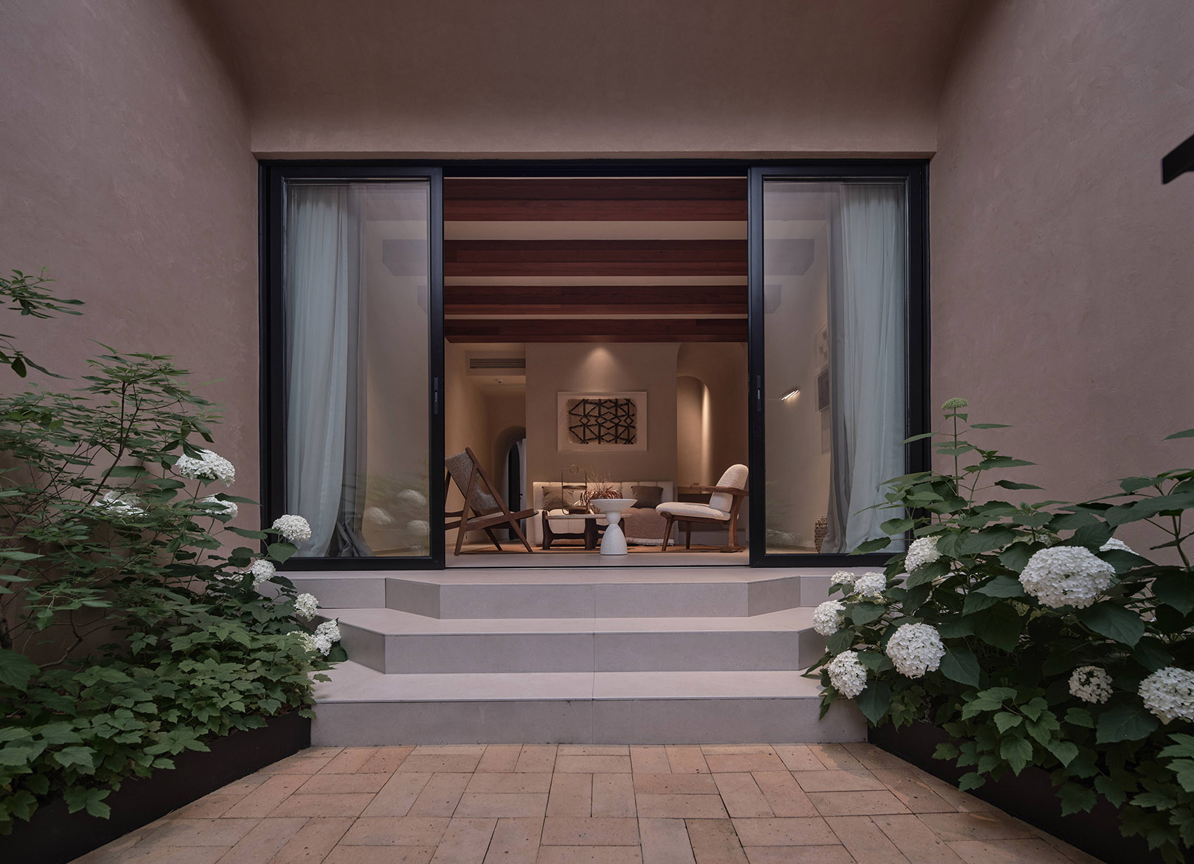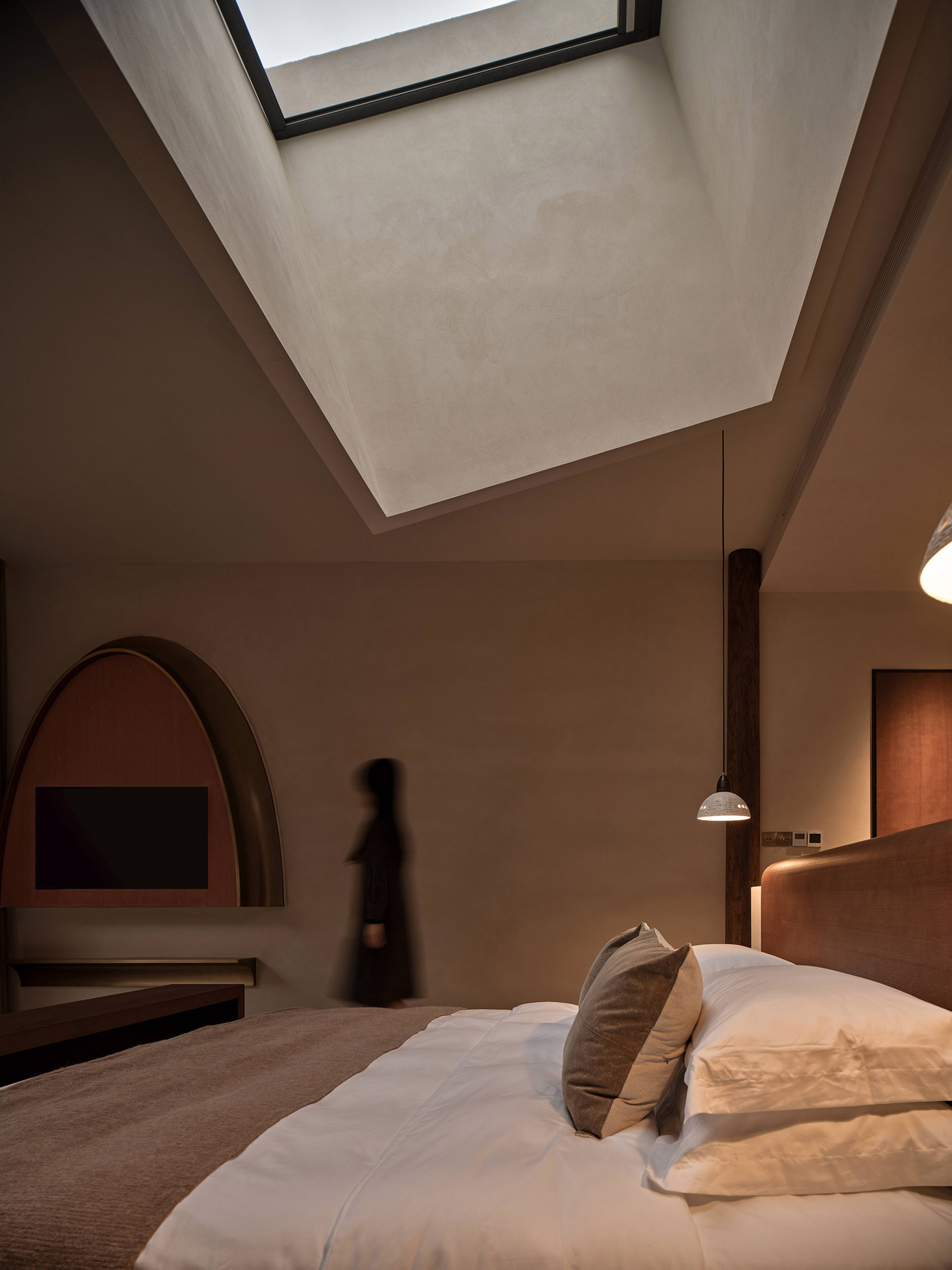 客房「赤」是一栋砖混结构的建筑,以拥抱的方式去迎接阳光与自然,让人的感受变得如此真实,行走在连廊楼宇间,干净的光穿透过建筑形成一道道钢琴键符;偶然开合于顶面的圆形窗户,让你驻足于本该匆匆而过的踏步之上。