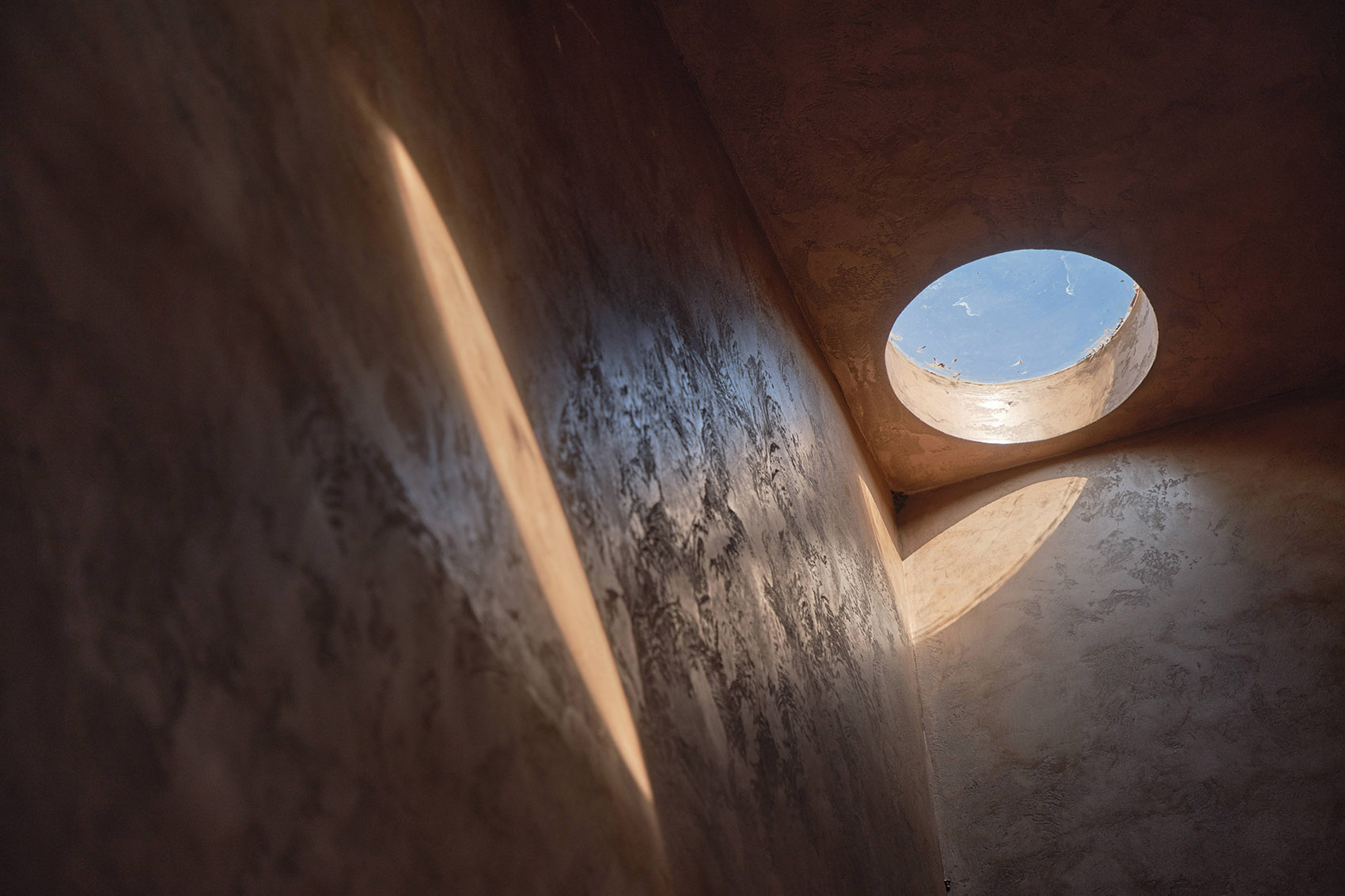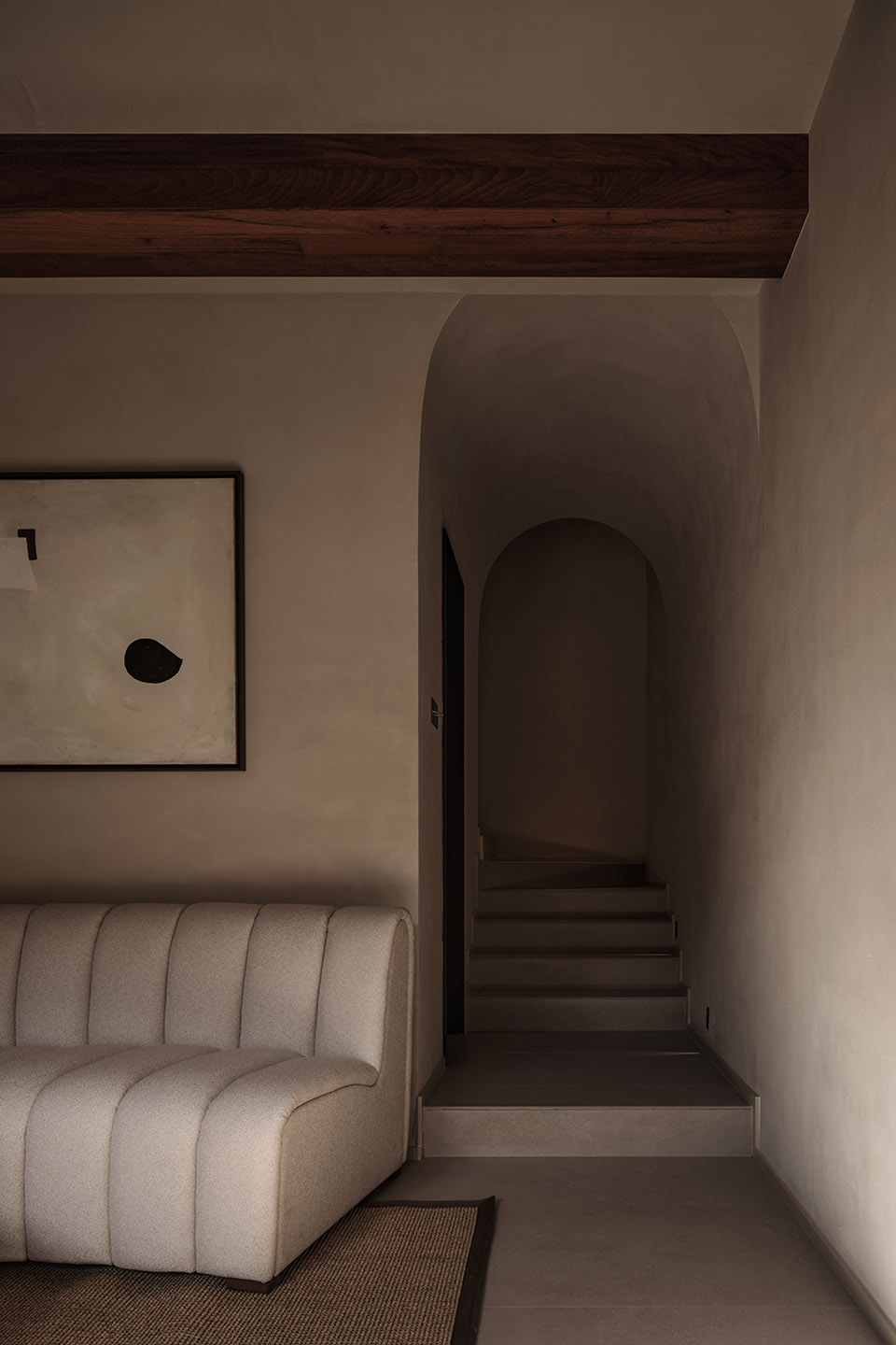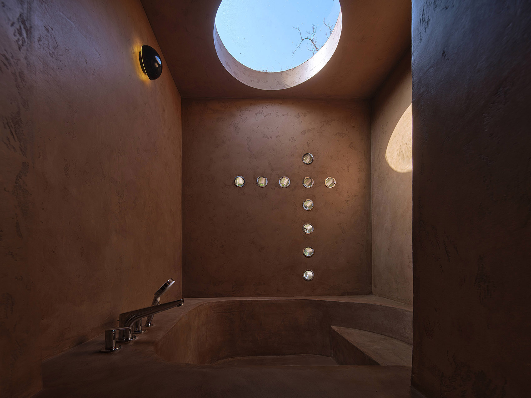 客房「赤」是一栋砖混结构的建筑,以拥抱的方式去迎接阳光与自然,让人的感受变得如此真实,行走在连廊楼宇间,干净的光穿透过建筑形成一道道钢琴键符;偶然开合于顶面的圆形窗户,让你驻足于本该匆匆而过的踏步之上。