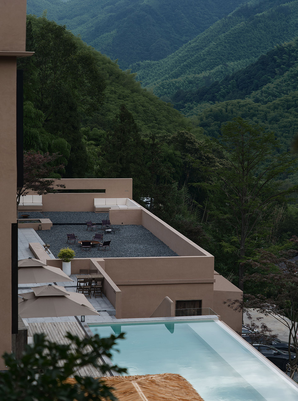 亿伽设计为您分享SHANAN·深溪汤泉酒店设计,三栋老房子错落的散布在半山腰上,周围气候丰富多样,木竹茂盛,远处一片山景,这是整个设计中的宝藏。它有着粗糙的土色的表皮,与简单直叙的几何语言,生于大地、隐于竹海之中。
