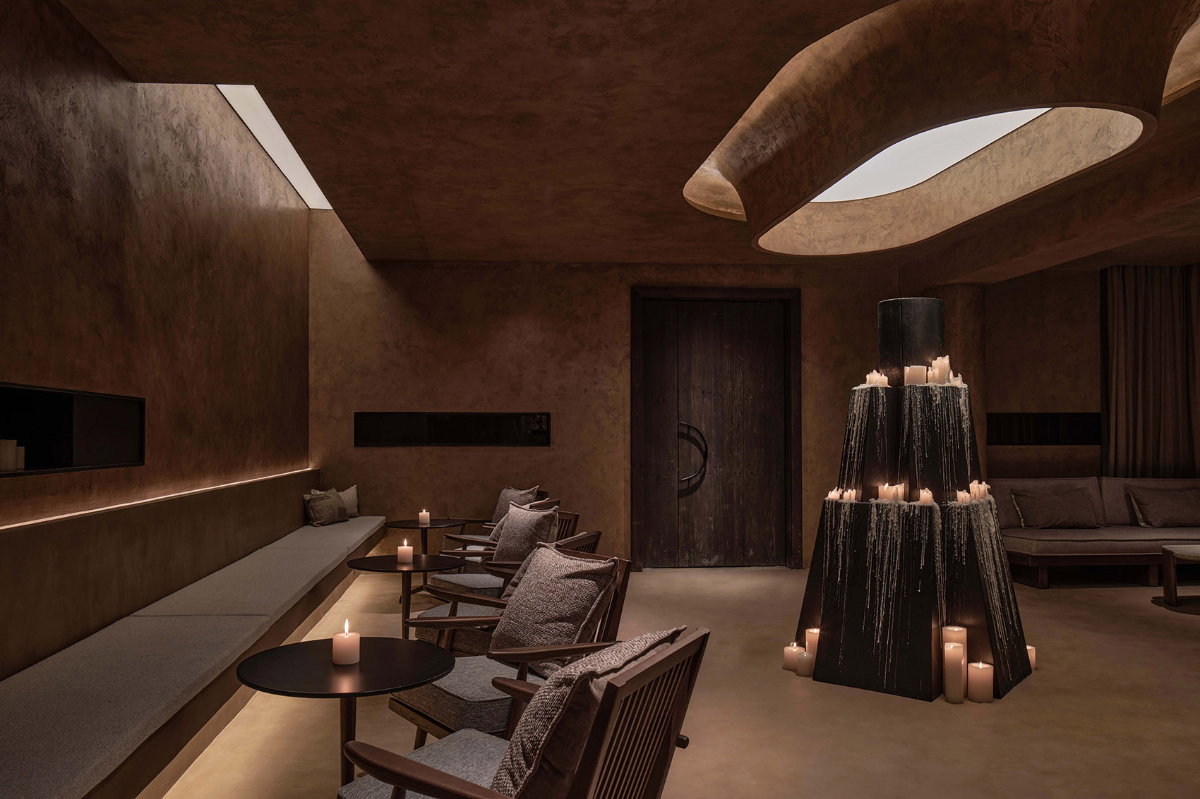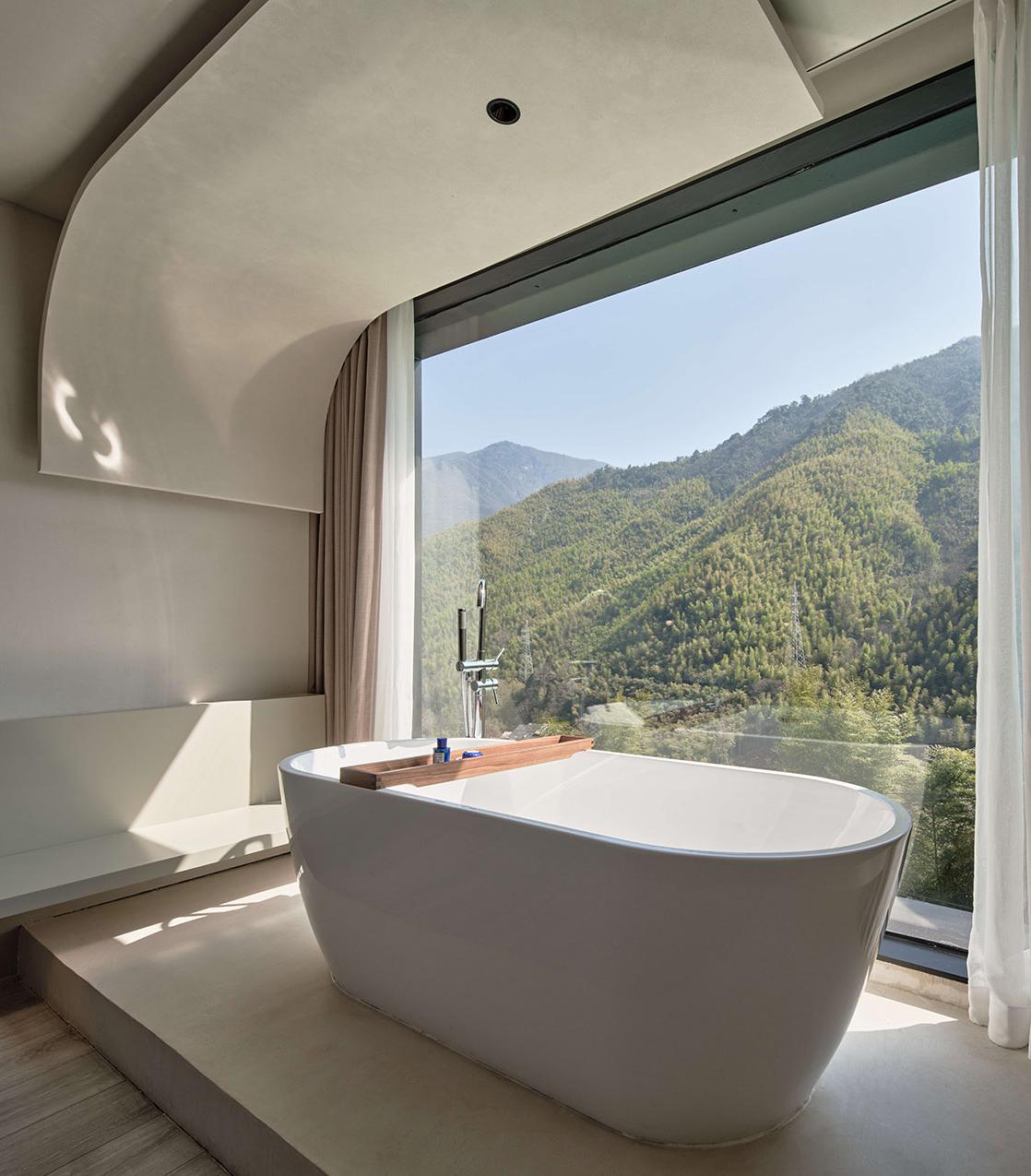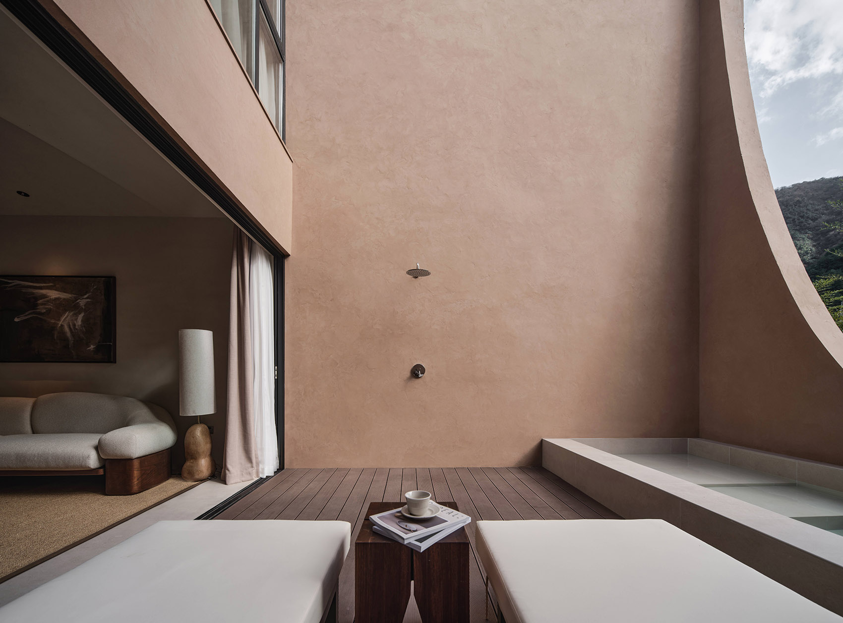 山顶的客房「需」楼,拥有更加私密且独立的景观、巨大的”U“字造型墙体将外界自然环境半包围式地纳入进整个客房空间,形成浑然一体的背景,在框住半边蓝天白云和植物的同时也将周边的其余事物都隔绝开来,更为私密的将这天地短暂地占为己有。