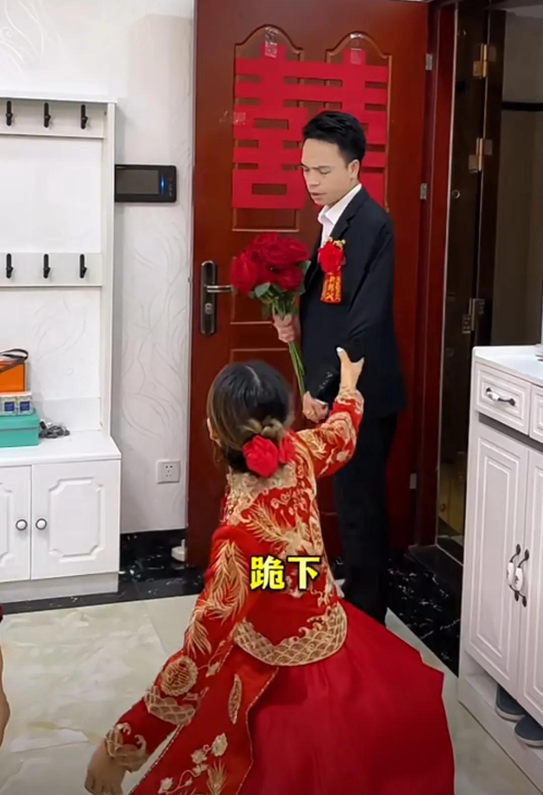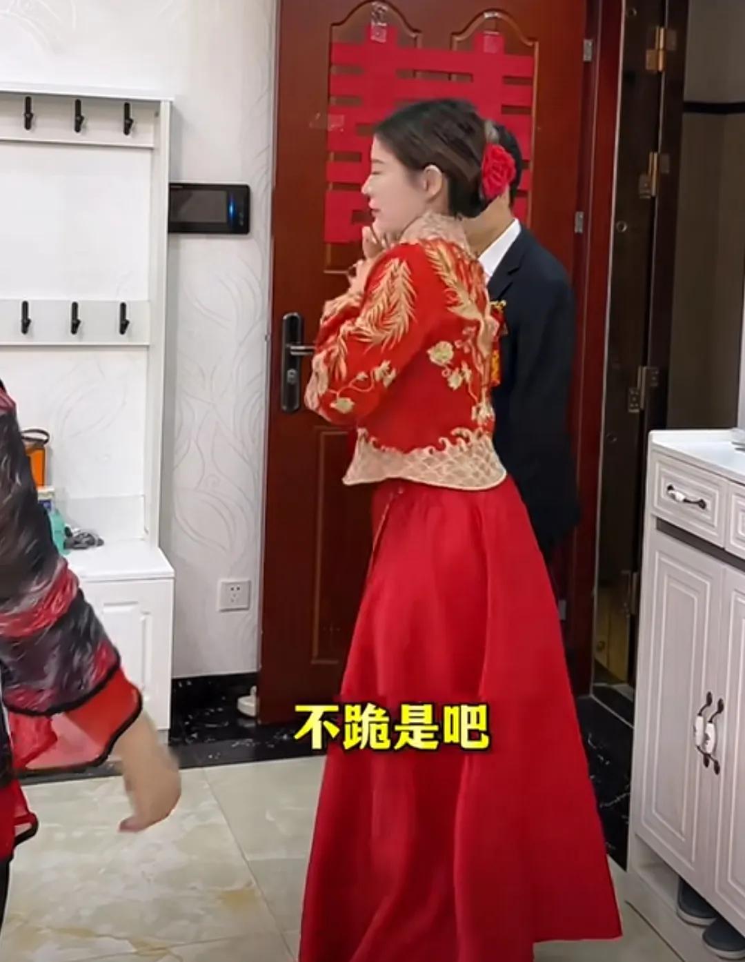 新娘一再要求新郎下跪,新郎不耐烦了,说:“要跪你自己跪,我是不可能跪她的,男儿膝下有黄金,怎么可能随便跪人。”