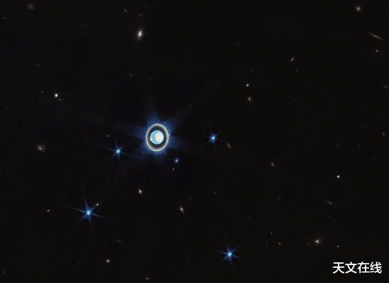 2023年2月6日詹姆斯·韦伯太空望远镜拍摄的天王星全尺寸广角照片,同时显示了其27颗已知卫星中的6颗。