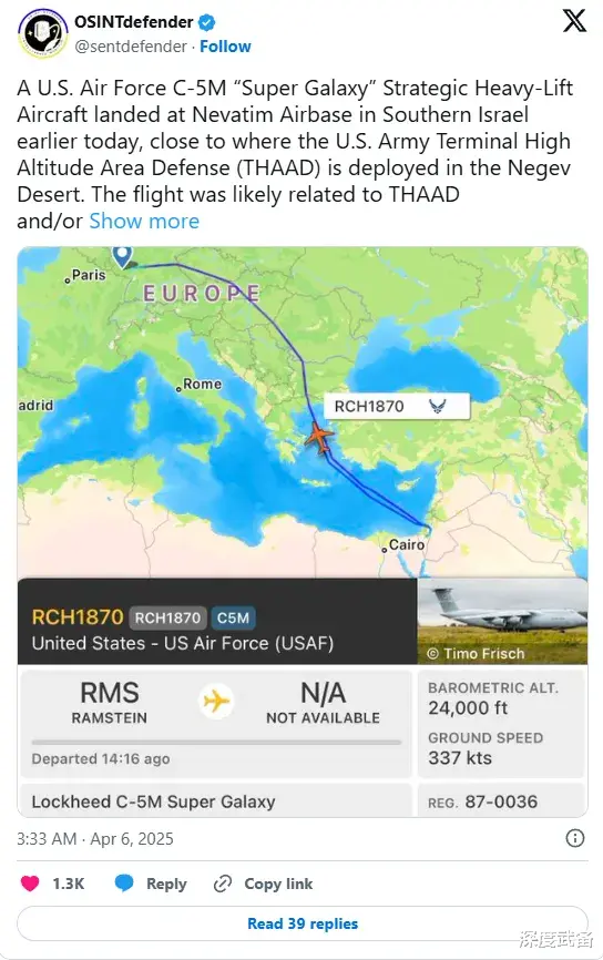 “保加利亚军事”网站称,开源情报显示,4月5日,美国空军一架C-5M“超级银河”运输机从德国拉姆施泰因空军基地出发,降落在以色列南部的内瓦蒂姆空军基地。消息人士透露,这架运输机就是执行向以色列运送“萨德”反导系统的任务。该反导系统由洛克希德·马丁公司研制,号称是“唯一可以在大气层内和大气层同时实施拦截的反导系统”,最大拦截高度达150公里。相比美军和以色列装备的其他末段反导系统,“萨德”系统的作战高度更高,并且能击落速度更快的威胁,主要针对的就是射程在1500-3000公里左右的中程弹道导弹。一套典型的“萨德”系统由移动火控和指挥控制中心、地面AN/TPY-2远程X波段雷达和最多9辆发射车组成,每辆发射车携带有8枚拦截导弹,理论上可以快速引导72枚导弹同时拦截36个来袭目标。