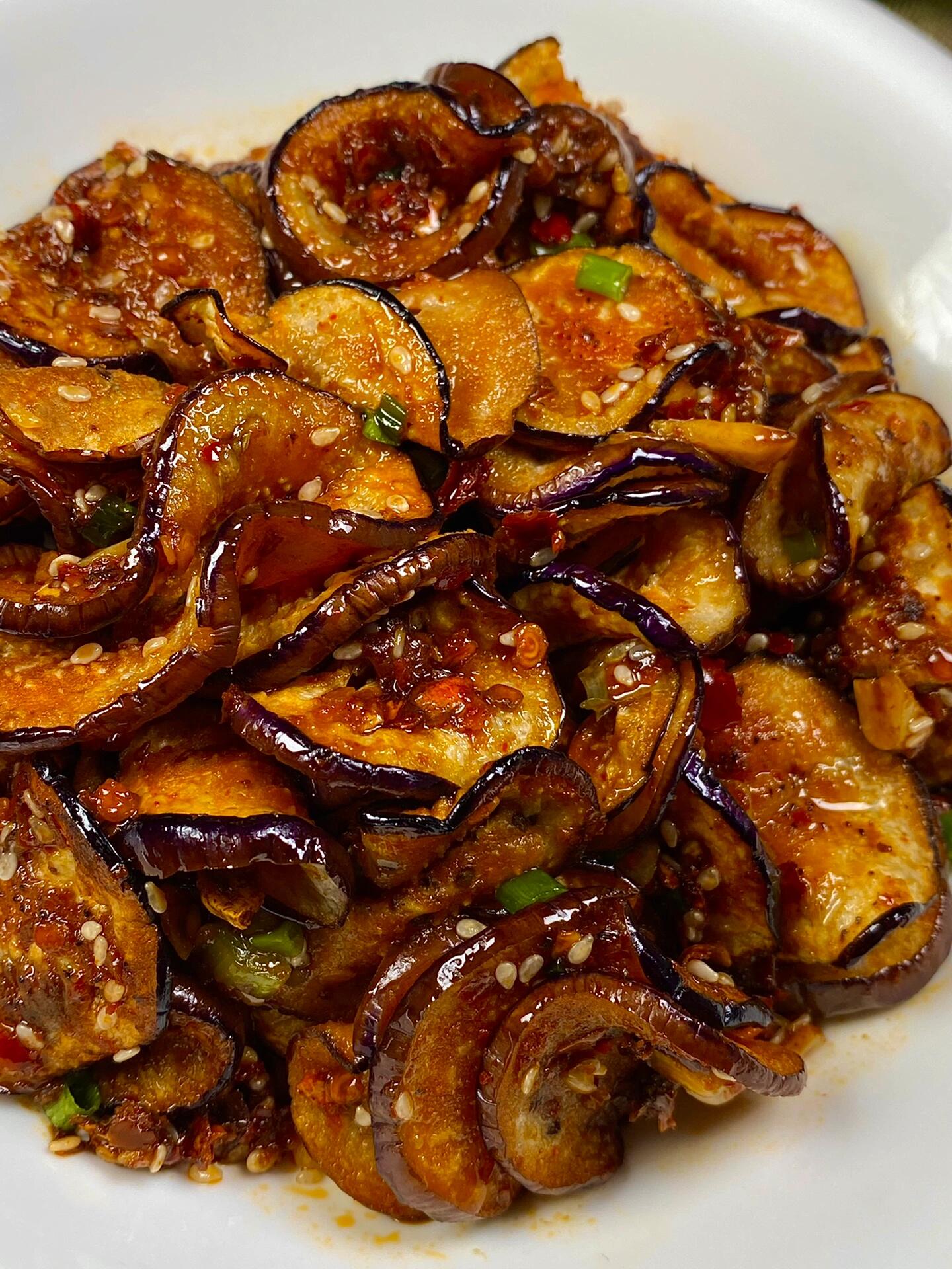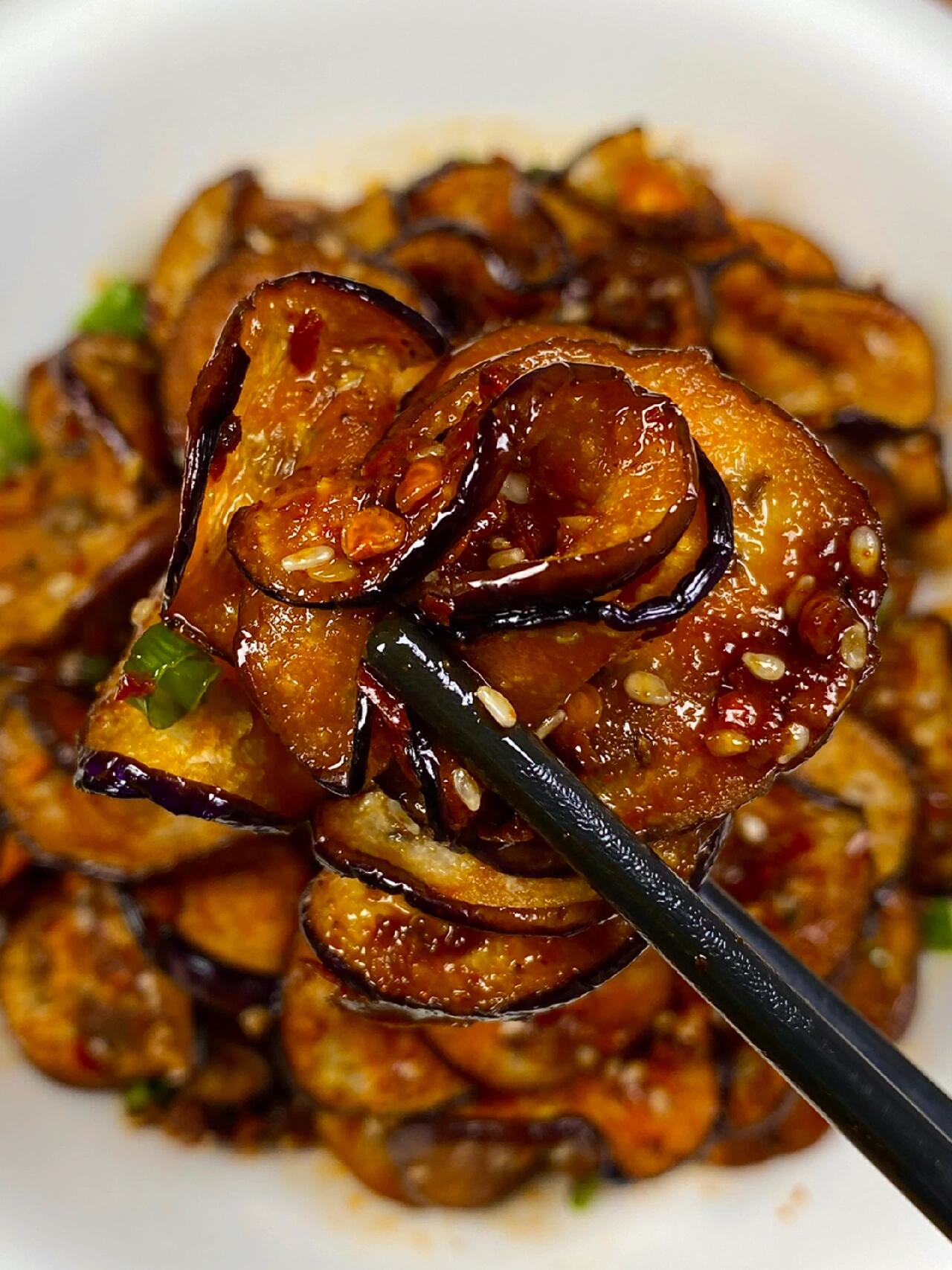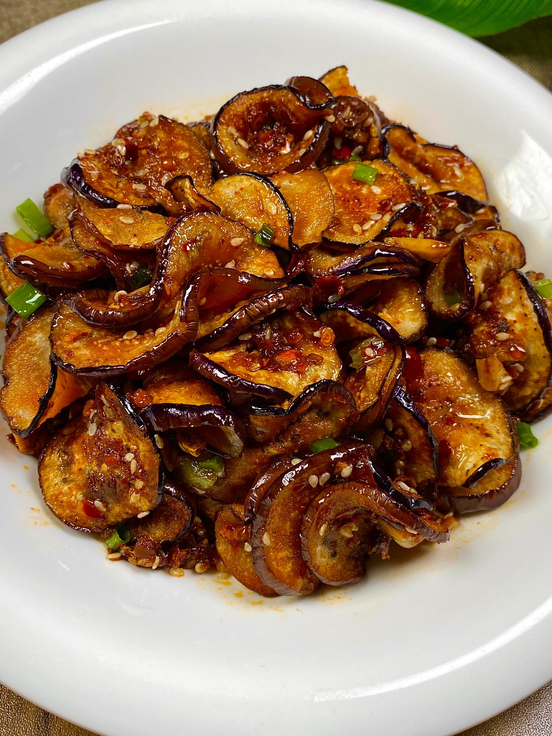 夹一片送进嘴里,第一感觉是软糯——茄子煎得恰到好处,软而不烂,入口即化,轻轻一抿就散开了。接着是酱汁的香辣,蒜香和辣椒的香味在嘴里散开,芝麻的香气若有若无地飘着。生抽和蚝油的咸鲜恰到好处,一点点白糖让整体更柔和,不会太冲。茄子本身的清甜还在,没有被酱汁完全掩盖,和咸鲜辣味形成奇妙的平衡。一片接一片,根本停不下来,筷子越动越快,盘子越来越空。