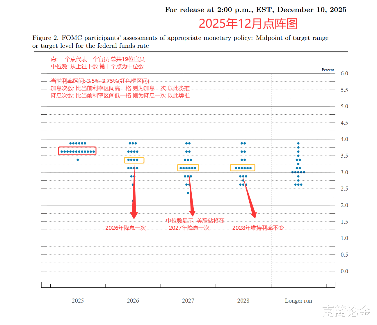 当地时间周三,美联储果然实施了降息策略,将指标政策利率区间下调25个基点至 3.50%-3.75%。虽然有三位决策者投了反对票,但是从点阵图中位数看到,目前大致指向为,在2026年降息一次,2027年降息一次,2028年维持利率不变。