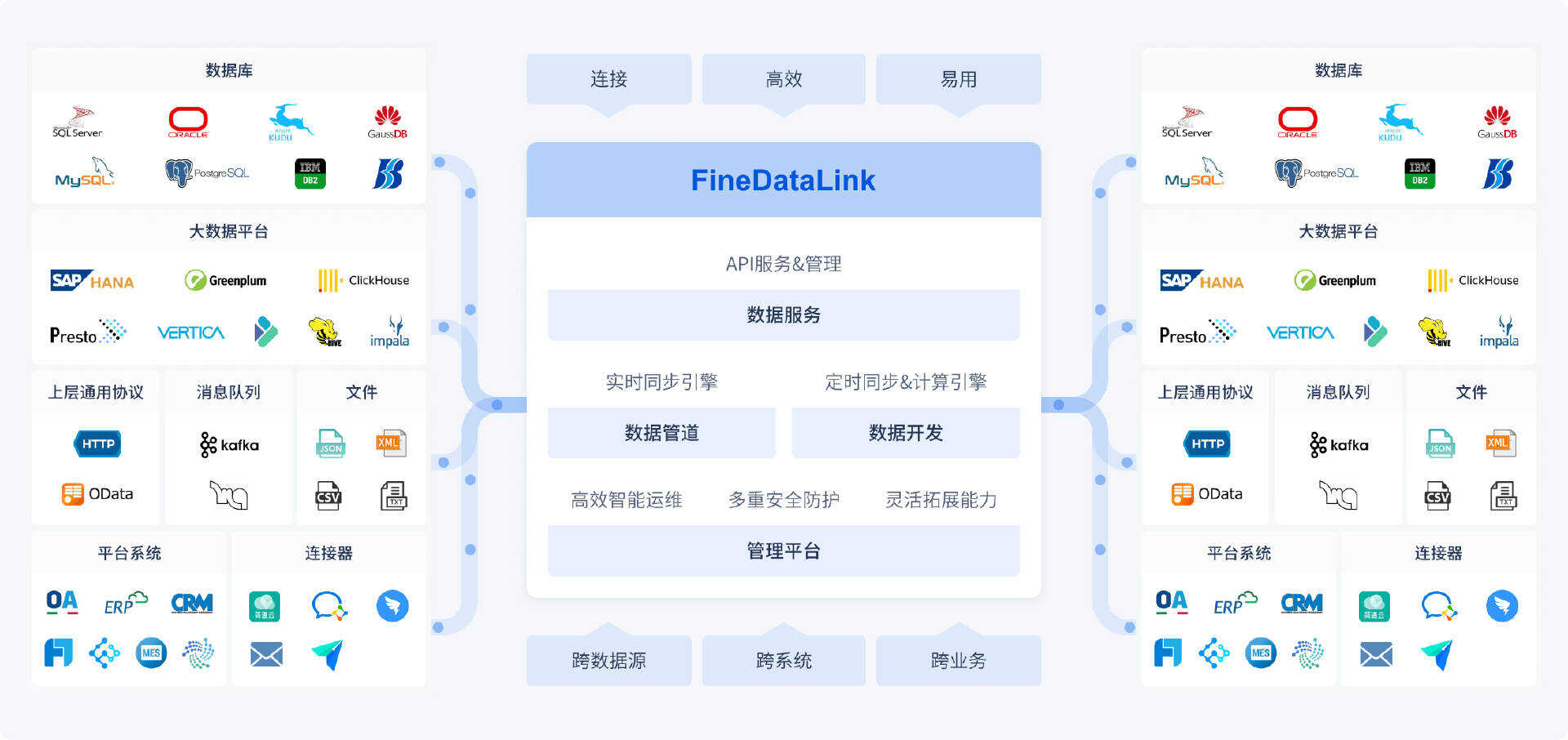 多源异构数据集成与同步,你可以通过简单的配置,将来自MySQL、Oracle、SQL Server等传统数据库,或Excel、CSV等文件,甚至通过API接口的SaaS应用数据,实时或定时地同步到指定的数据仓库、数据湖或分析数据库中。