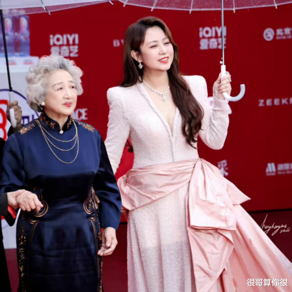 红毯上,马丽以粉色深V拖尾长裙亮相,搭配长卷发和淡雅妆容,整体造型既柔美又吸睛。这一造型被多家媒体及网友评价为兼具温柔与气场,尤其撑伞雨中走红毯的画面更显浪漫氛围。