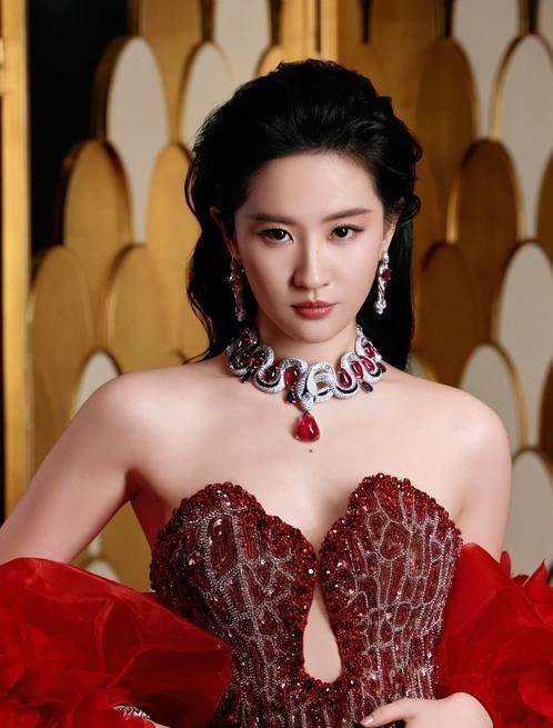 为了彰显对刘亦菲的重视,品牌特意给她戴上了昂贵的红宝石项链和耳环。