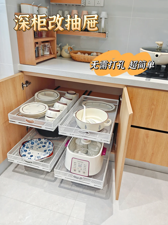 这样在拿取物品的时候就可以将拉篮下降到一个比较合适的位置,会更加的方便,而且物品摆放起来也会更规整一些。