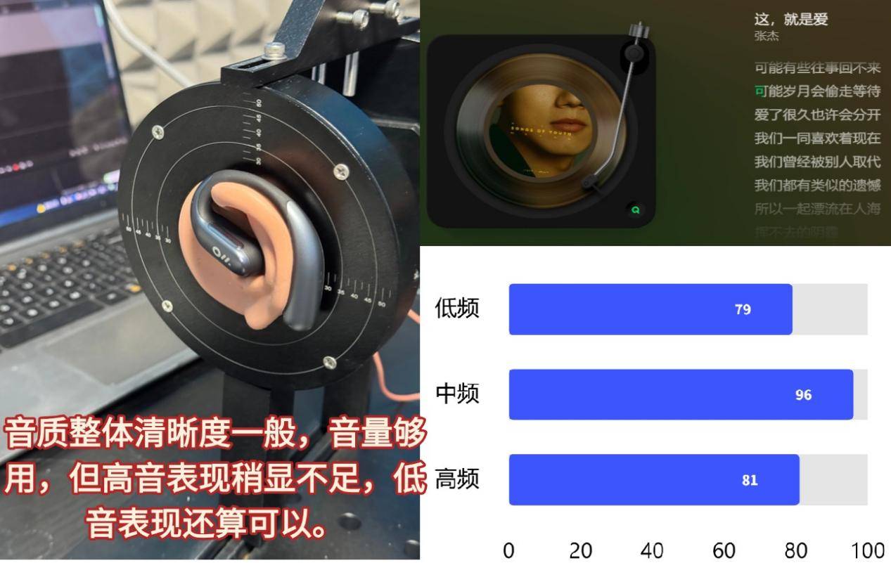 Oladance OWS Pro 采用了大口径动圈单元,音场开阔、空间感强,尤其在演绎古典音乐时,乐器间的定位非常清晰。听《这就是爱》这类节奏感强的歌曲时氛围十足。但在表现重低频段时,冲击力略显不足,极低频层次稍弱,高频部分偶有轻微破音或失真,整体清晰度还有进步空间,最终音质评分为 7.5 分。