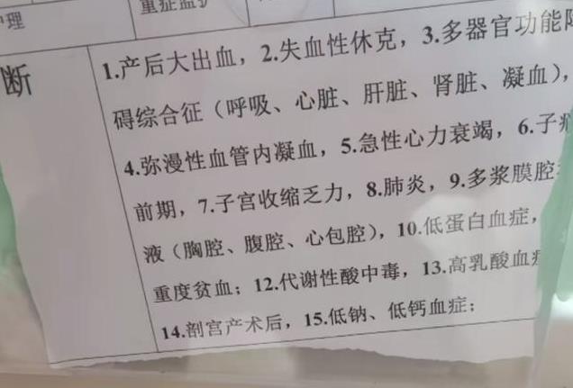 吴霜并不仅仅是简单的产后大出血,还伴随有多器官功能障碍综合征、急性心力衰竭、肺炎、重度贫血等,诊断书上密密麻麻写满了15种病症。