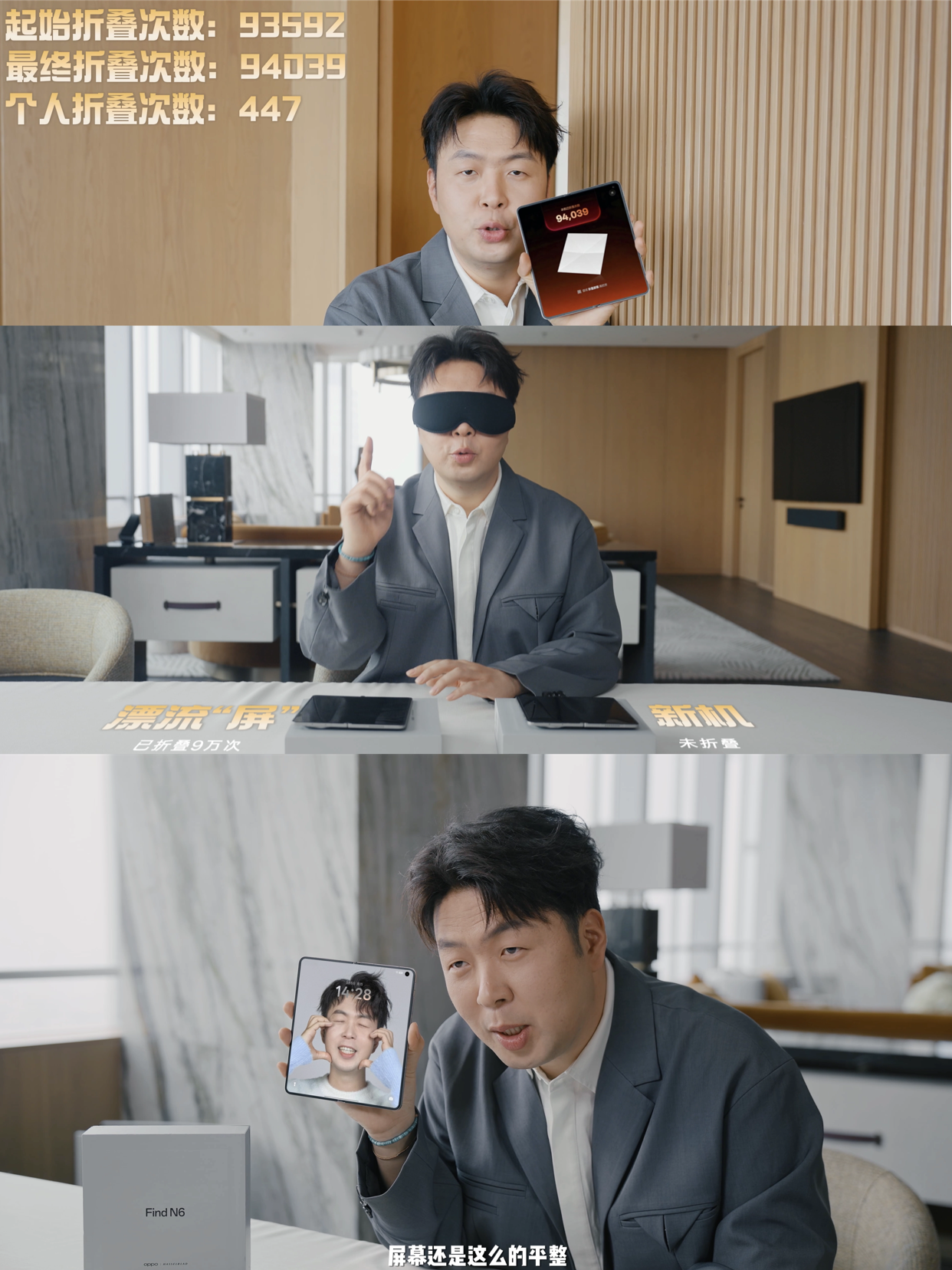 这台Find N6漂流到杜海涛手里的时候,屏幕已经被折了9万多次,然而离谱的是,杜海涛蒙眼摸这台Find N6和一台全新机,竟然摸不出来哪台是新机、哪台是折叠过九万多次的,这屏幕平整度也太牛了吧?