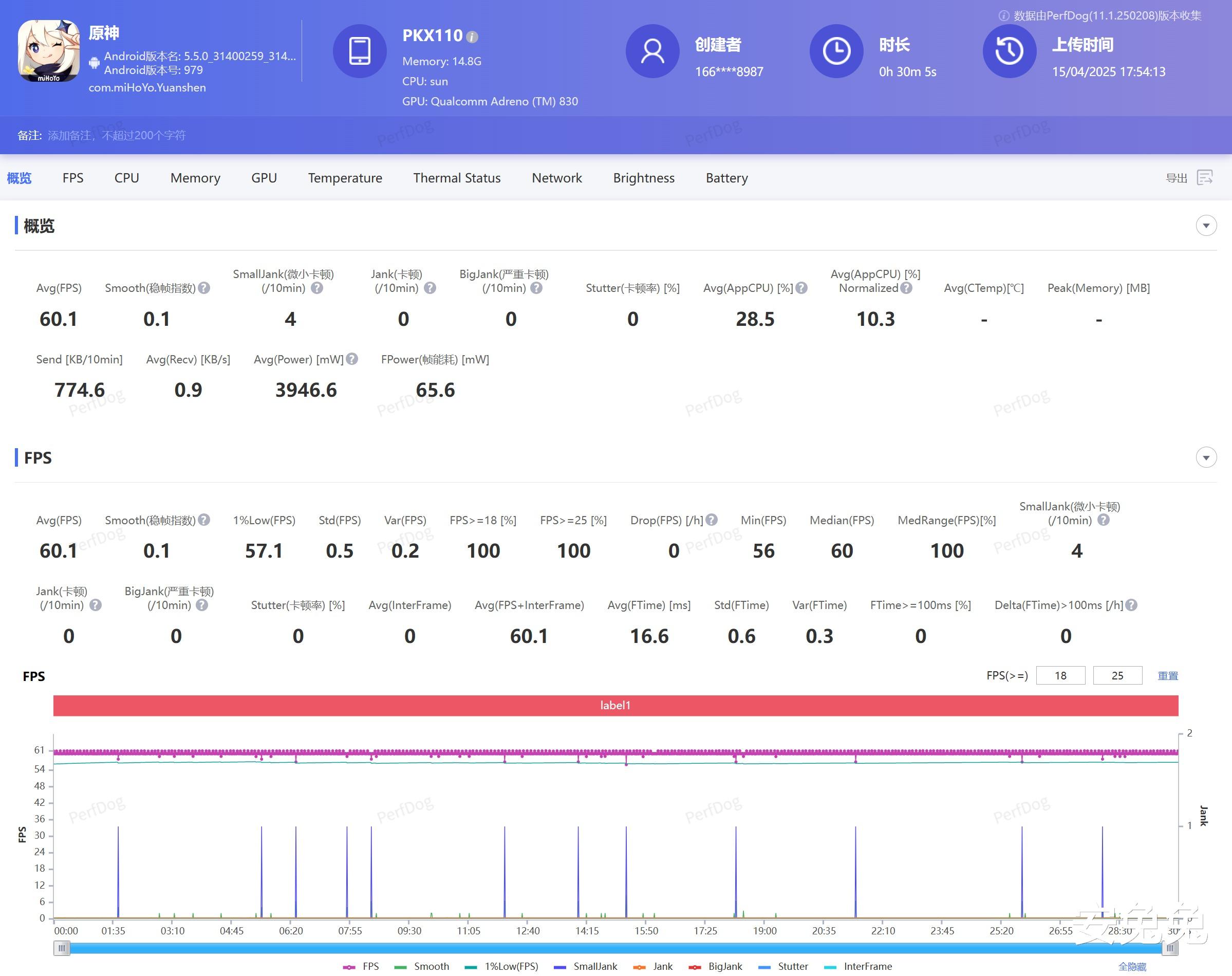 《王者荣耀》这样的低负载游戏自不必多说,一加13T在30分钟《原神》须弥城跑图测试中,得到了平均60.1帧,机身最高42.9℃的优秀成绩。