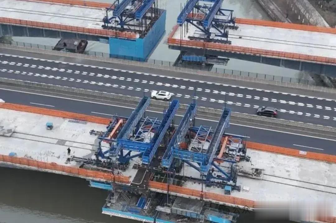 目前杭宁高速湖州市区联络线工程关键控制节点,全长超过4000米的观音山隧道工程已经掘进到2600米以上,目标是2026年内贯通。此外,联络线工程龙溪港特大桥、湖州北枢纽主线桥钢箱梁架设作业也已经接近尾声,全线首段基层水稳施工启动。