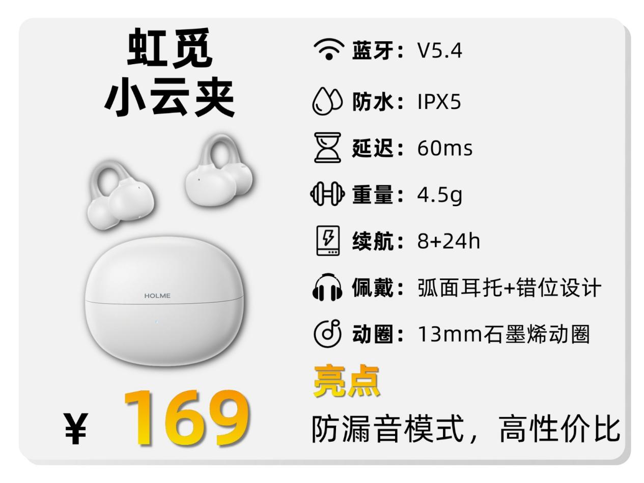 虹觅小云夹在佩戴上玩出了新花样,2.5mm 前高后低的错位设计贴合耳道自然结构,戴上去稳稳当当不晃动;电池仓的 12° 弧面耳托还能托住耳背分散压力,久戴无负担。更绝的是它 4.5g 的单只重量,轻到几乎让人忘记佩戴,连续三四个小时也毫无夹耳感。音质上,石墨烯动圈单元凭借优秀的形变能力,让声音细节清晰可辨,听感真实细腻。自研防漏音模式一键解决外放尴尬,地铁、办公室使用都很合适;HBC 智能双联功能还能让一副耳机拆成两幅单独用。论佩戴舒适度、音质表现和实用性能,它都是百元档耳夹式耳机里的天花板!