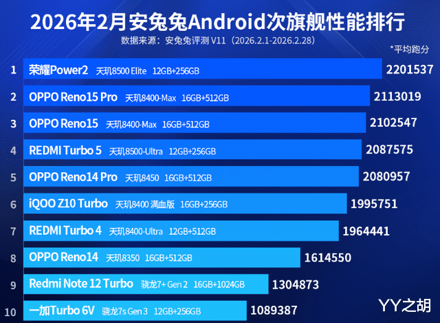 最后,在2026年2月份安兔兔安卓次旗舰手机性能排行榜中,REDMI Turbo4和OPPO Reno4分列第七名和第八名。在安兔兔平台上,这两款智能手机的平均跑分分别为1964441分和1614550分。在此之后,Redmi Note 12 Turbo和一加Turbo 6V分列第九名和第十名。在安兔兔平台上,这两款智能手机的性价比评分分别为1304873分和1089387分。其中,一加Turbo6V搭载第四代骁龙7s Gen4(台积电制程,2.7GHz峰值主频),本机存储配置为12+512G版本(UFS3.1),运行内存可翻倍拓展,实现12GB+12GB组合。