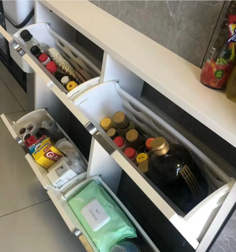 抽屉式收纳更便捷:调料篮抽屉和子母抽屉的设计,让调料和餐具的收纳变得井井有条。烹饪之际,仅需轻轻一拉,所需之物即刻尽在掌控之中。