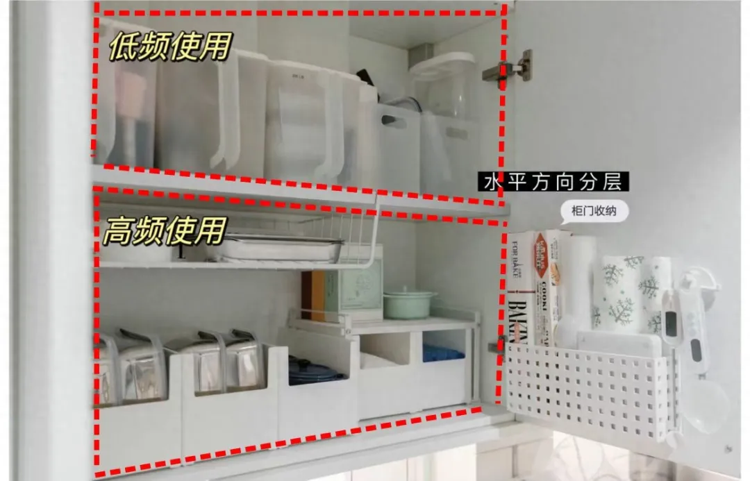 吊柜分区明确:吊柜上层可存放不常用的厨房工具和日用品囤货,而将经常使用的厨房用纸、保鲜膜等放在更易拿取的下层,这样既能保证收纳空间,又方便日常使用。