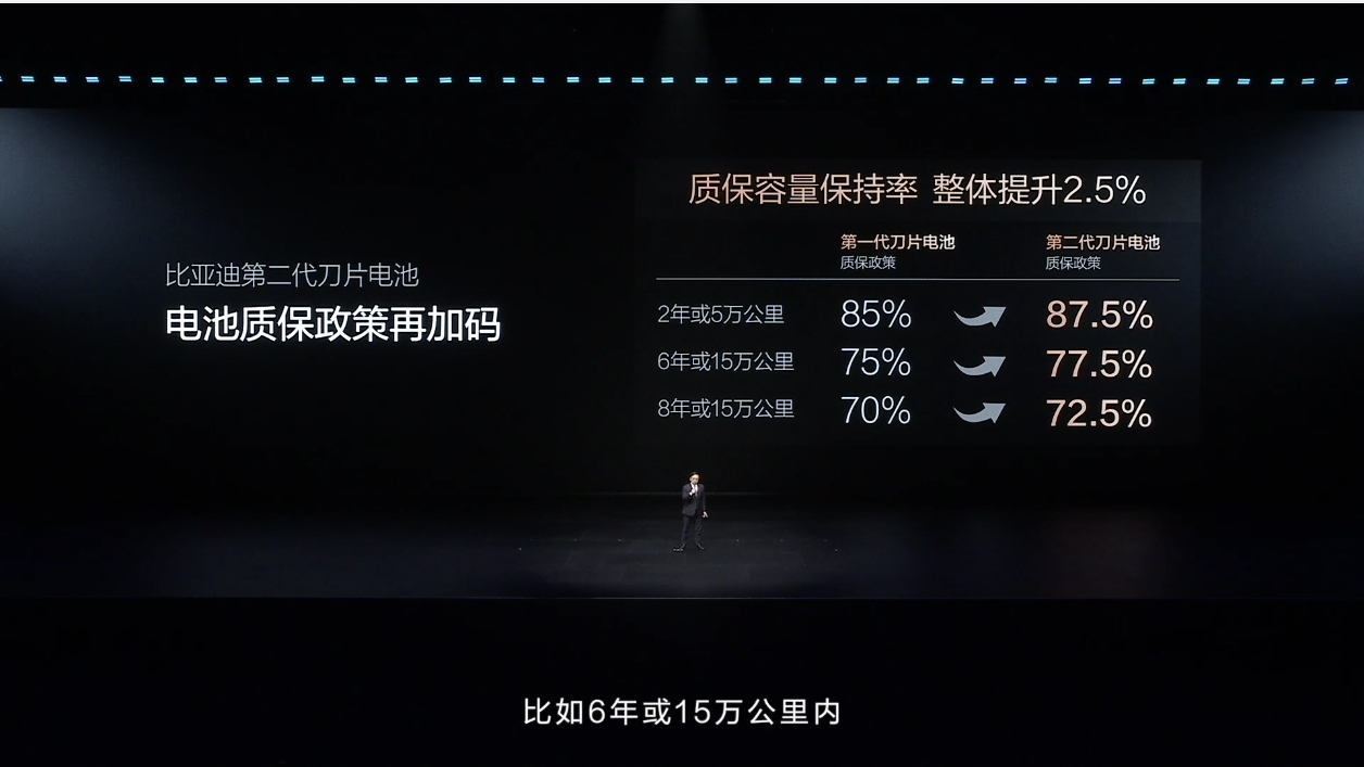 更有底气的是质保直接加码:6年/15万公里内,容量低于77.5%就免费换,比上一代提了2.5%,电芯还终身保修,这就是对寿命的绝对自信。