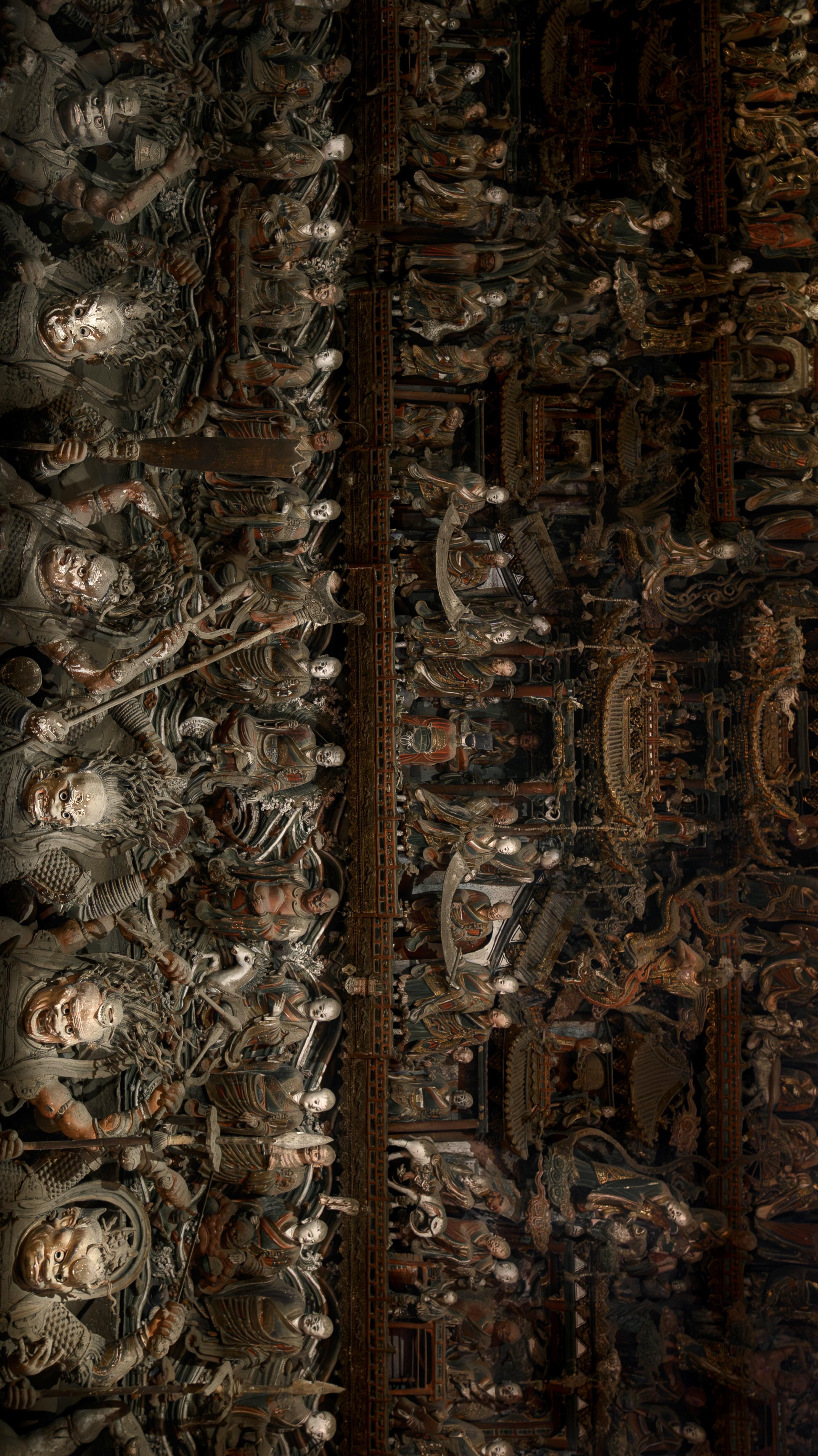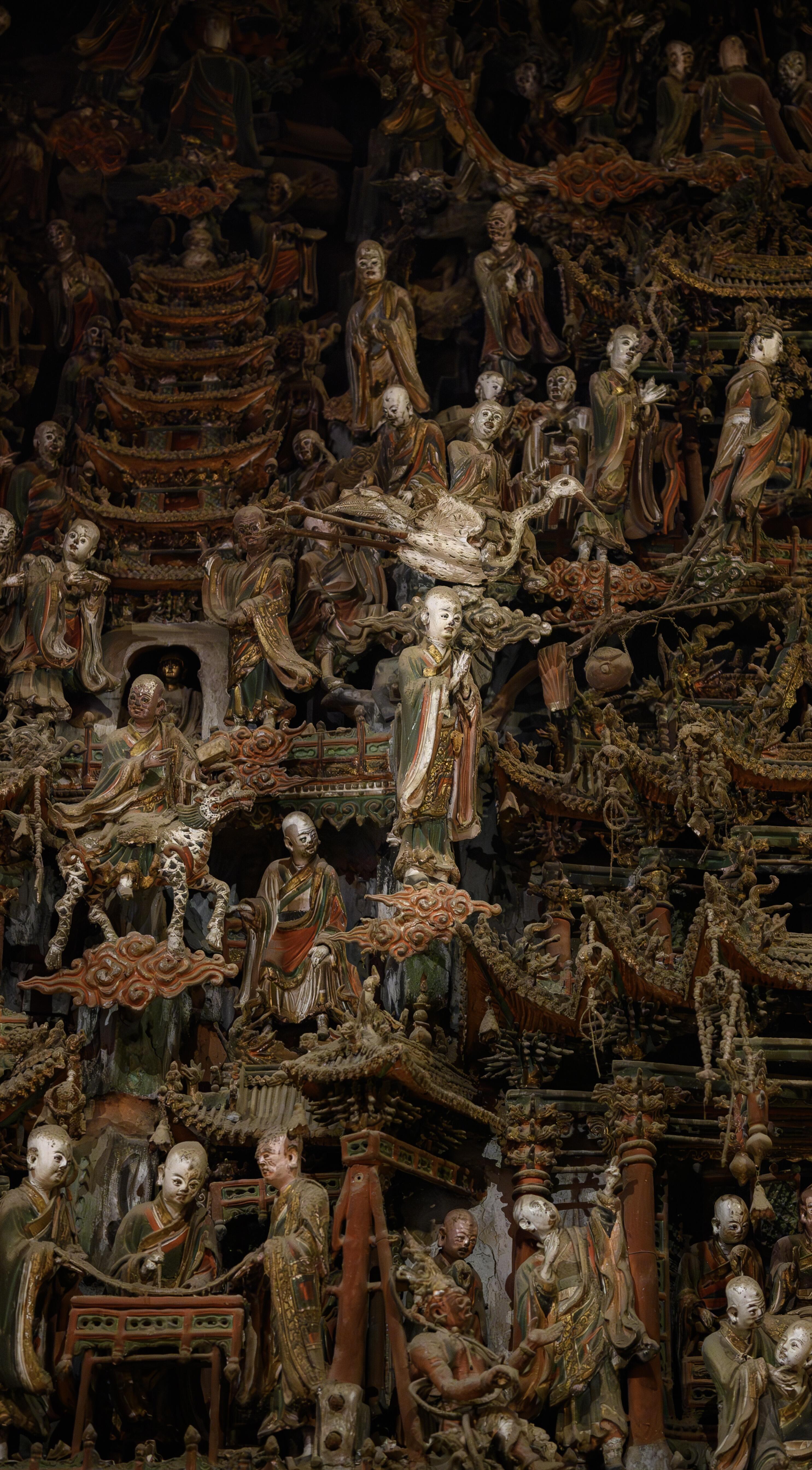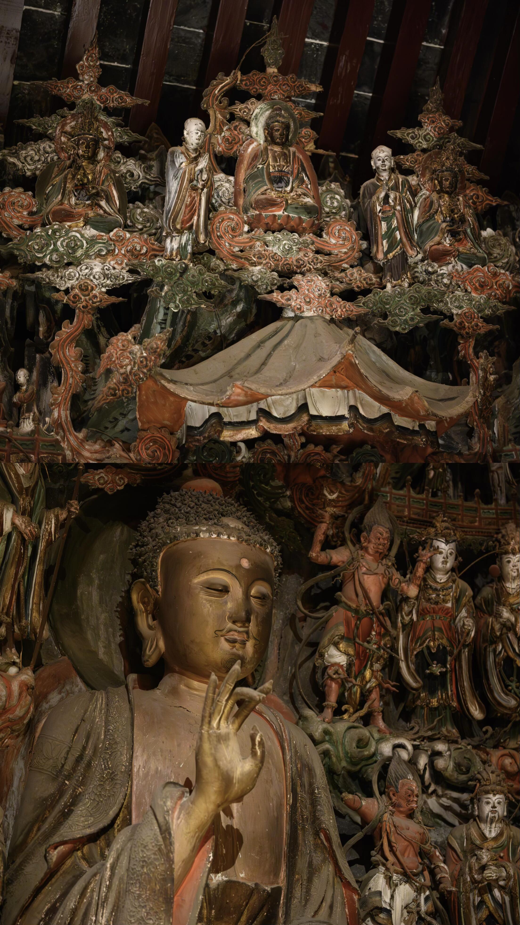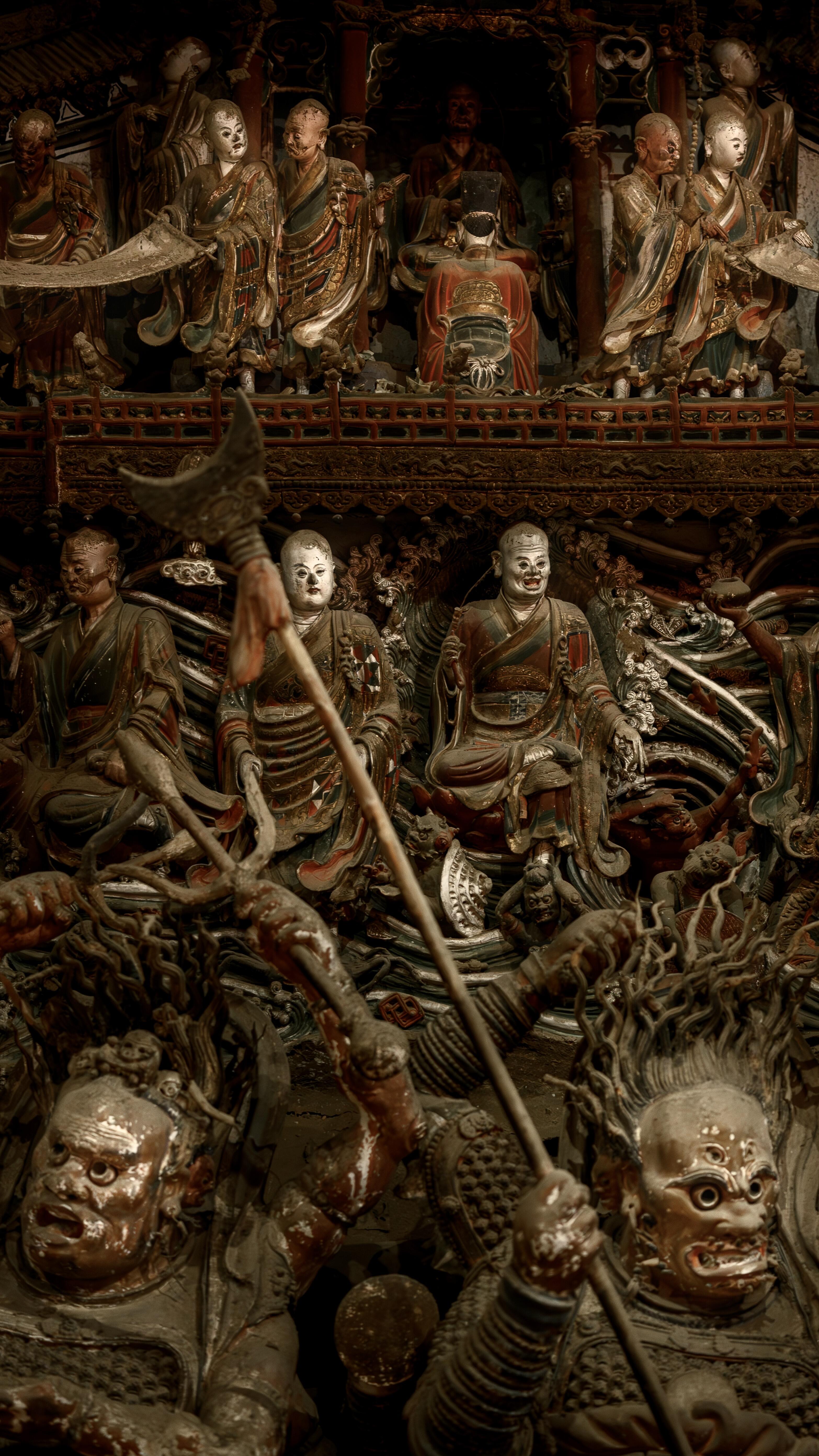走进大殿的瞬间,我被眼前的景象惊得说不出话。整座大殿十三面墙壁上,密密麻麻布满了泥质彩塑,悬塑、圆雕、浮雕、镂刻交织在一起,3700余尊塑像层层叠叠,从墙根一直延伸到梁架之上,几乎不留一丝空隙。光线从殿宇高处的窗棂透进来,在色彩斑驳的塑像上流动,那些历经四百余年的泥像仿佛瞬间有了生命,神目灼灼,似在凝视着每一位闯入者。我想起旁人说的,早年这里无人看护,人们可以近距离触摸这些塑像,指尖划过衣纹的褶皱,感受泥土的温度。如今隔着围栏,我只能踮起脚尖细细打量,相机快门不停按下,即便有些画面因光线昏暗而模糊高噪,也舍不得放过任何一处细节。
