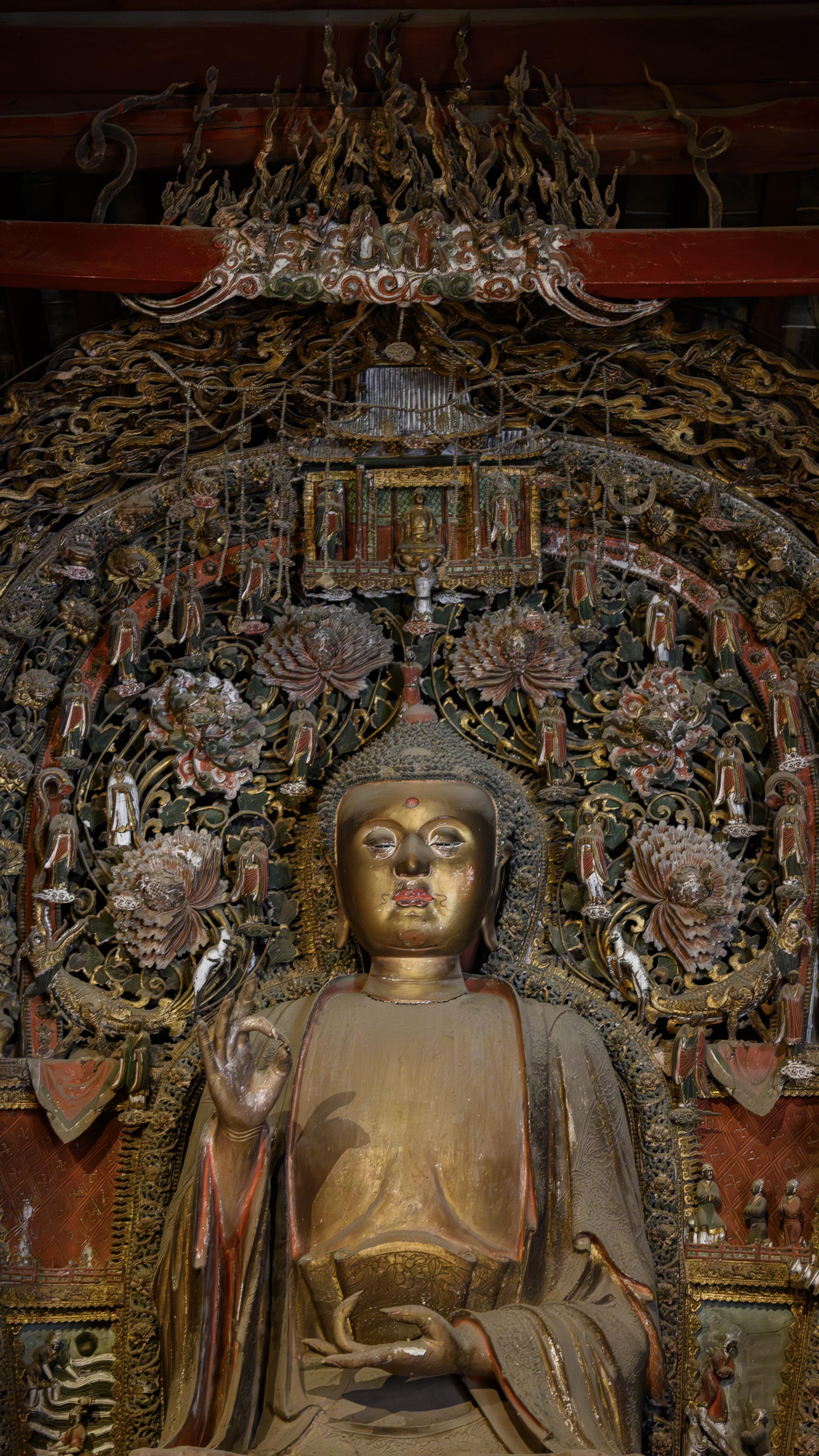 大殿中央的中隔正壁,横三世佛结跏趺坐于莲台之上,高3.5米的塑像神态安详,睿目含慧。释迦牟尼佛的背光最为惊艳,椭圆状的放射图案层层复叠,金龙盘绕,异花生彩,七宝璎珞垂挂,十方诸佛、天人菩萨护法神错落其间,甚至能看到人形金翅鸟的身影,一片金光闪烁,仿佛真的能窥见西方极乐世界。左侧阿弥陀佛身后的背光里,西方三圣并肩而立,庞大的伎乐队伍栩栩如生,仿佛能听见那些早已消散在时光里的梵音。右侧药师佛的塑像线条圆润,周身环绕着象征吉祥的瑞兽,神情悲悯,似在普度众生。
