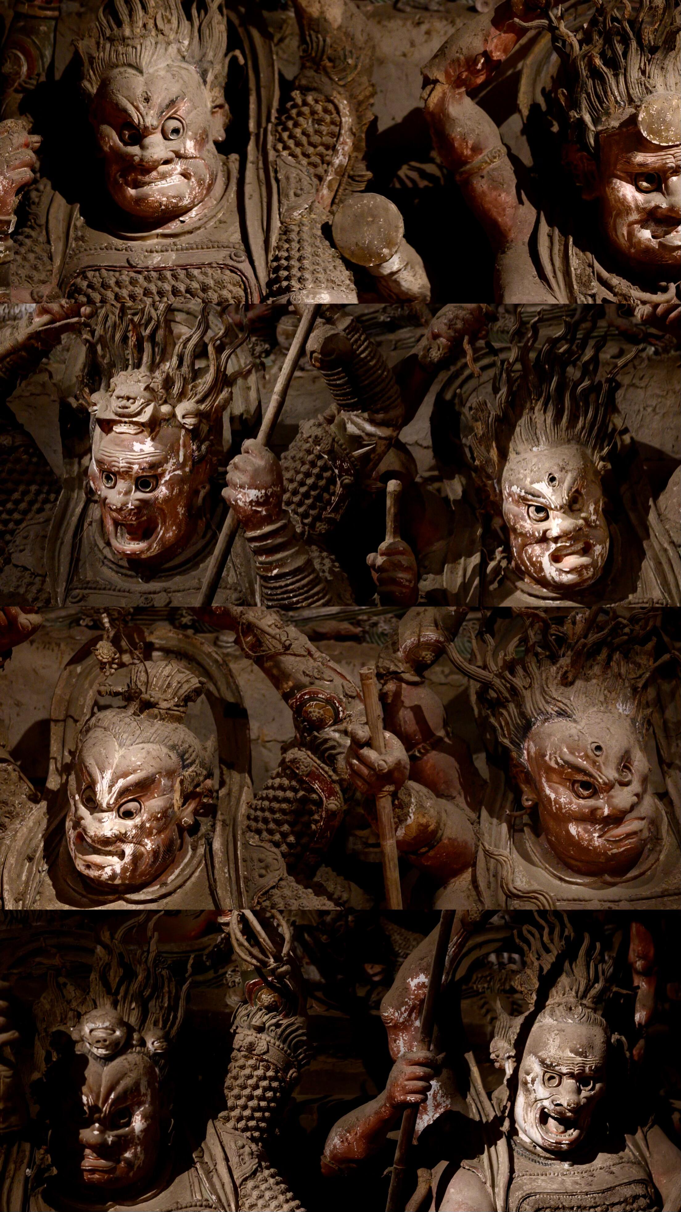 顺着墙壁慢慢挪动脚步,东西两壁的塑像更让人叹为观止。山墙下部是五百罗汉过海图,汹涌的波涛用泥塑层层堆叠,浪花的褶皱清晰可见,五百罗汉各施法宝,有的踏浪而行,有的端坐莲台,有的与妖魔搏斗,神态各异,动感强烈,仿佛下一秒就要从墙壁上跃下来。山墙上部则是释迦牟尼由凡入圣的八组故事,从入胎、降生、出游、逾城,到降魔、成道、说法、涅槃,连环壁塑衔接自然,通过山石的回环、林木的交错、庙宇的掩映,把不同的画面连成了彼此相通的艺术整体。我盯着那些小小的塑像,他们的表情细腻到能看清眉峰的弧度、嘴角的纹路,有的眉头紧锁,有的笑容慈悲,有的怒目圆睁,每一尊都有自己的性情与故事。