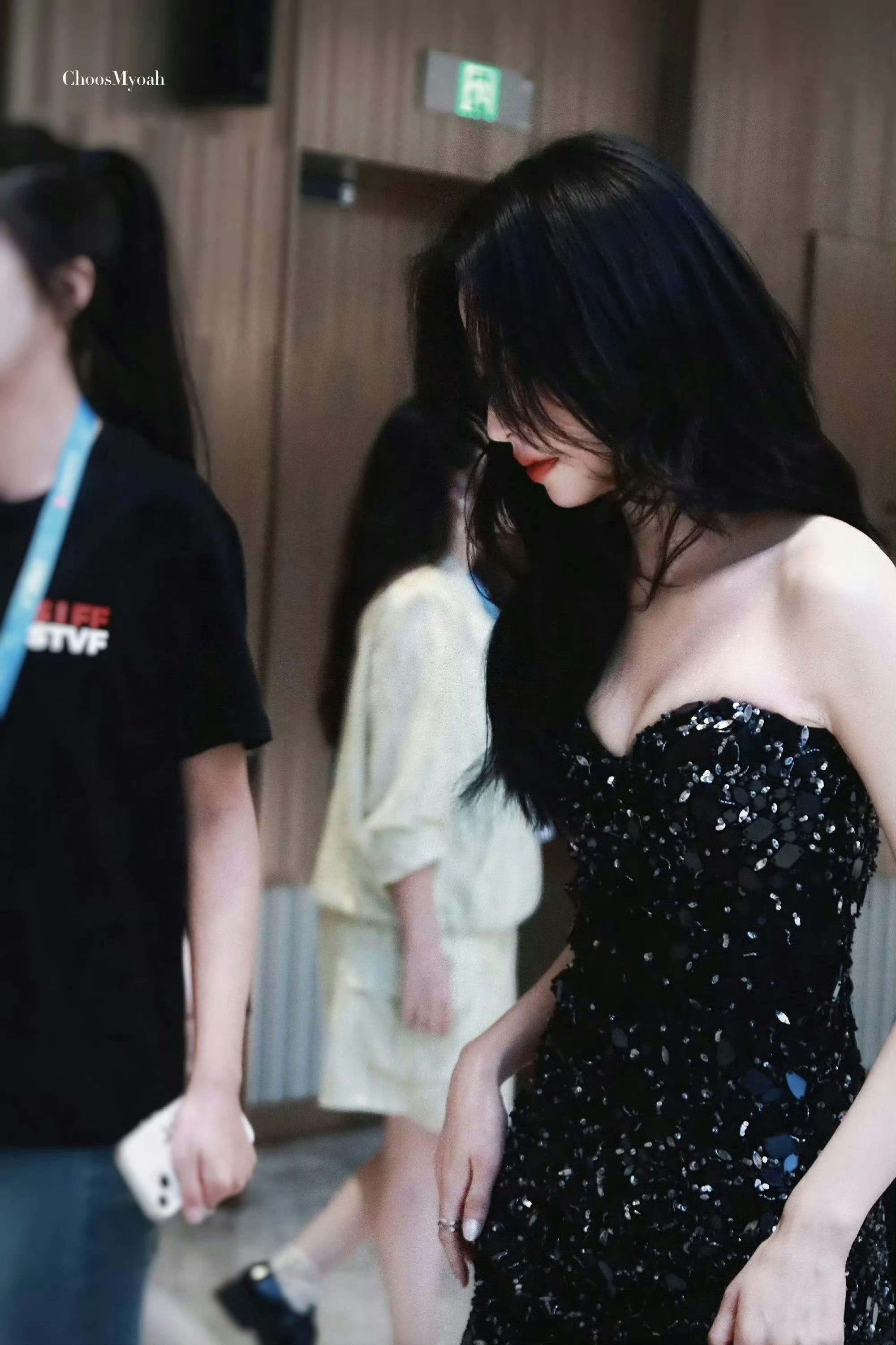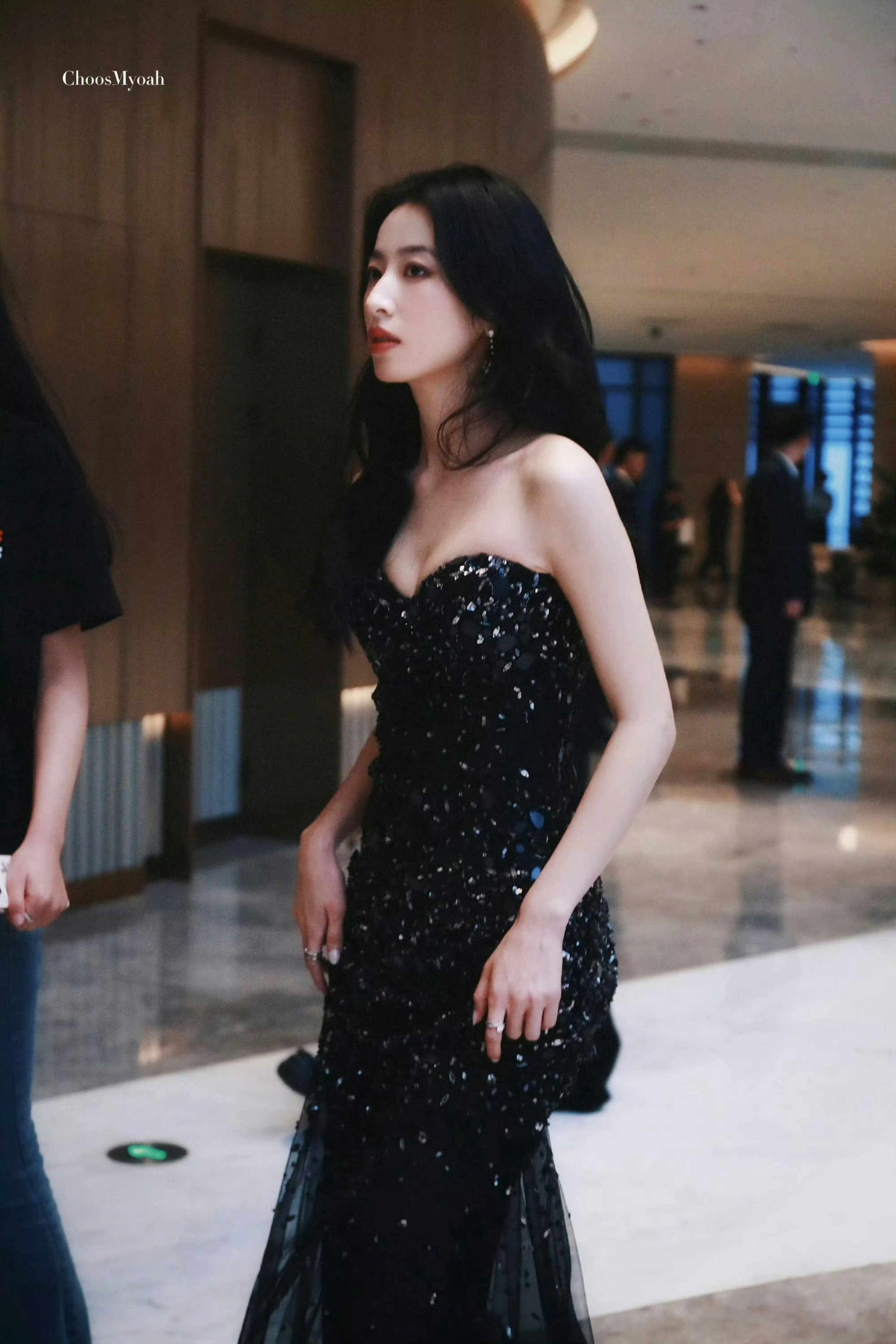 周雨彤一袭黑色抹胸裙,抹胸款式大胆又优雅,大方展露她优越的肩颈线条,同时让呼之欲出的事业线成为视觉焦点,性感魅惑却又恰到好处。