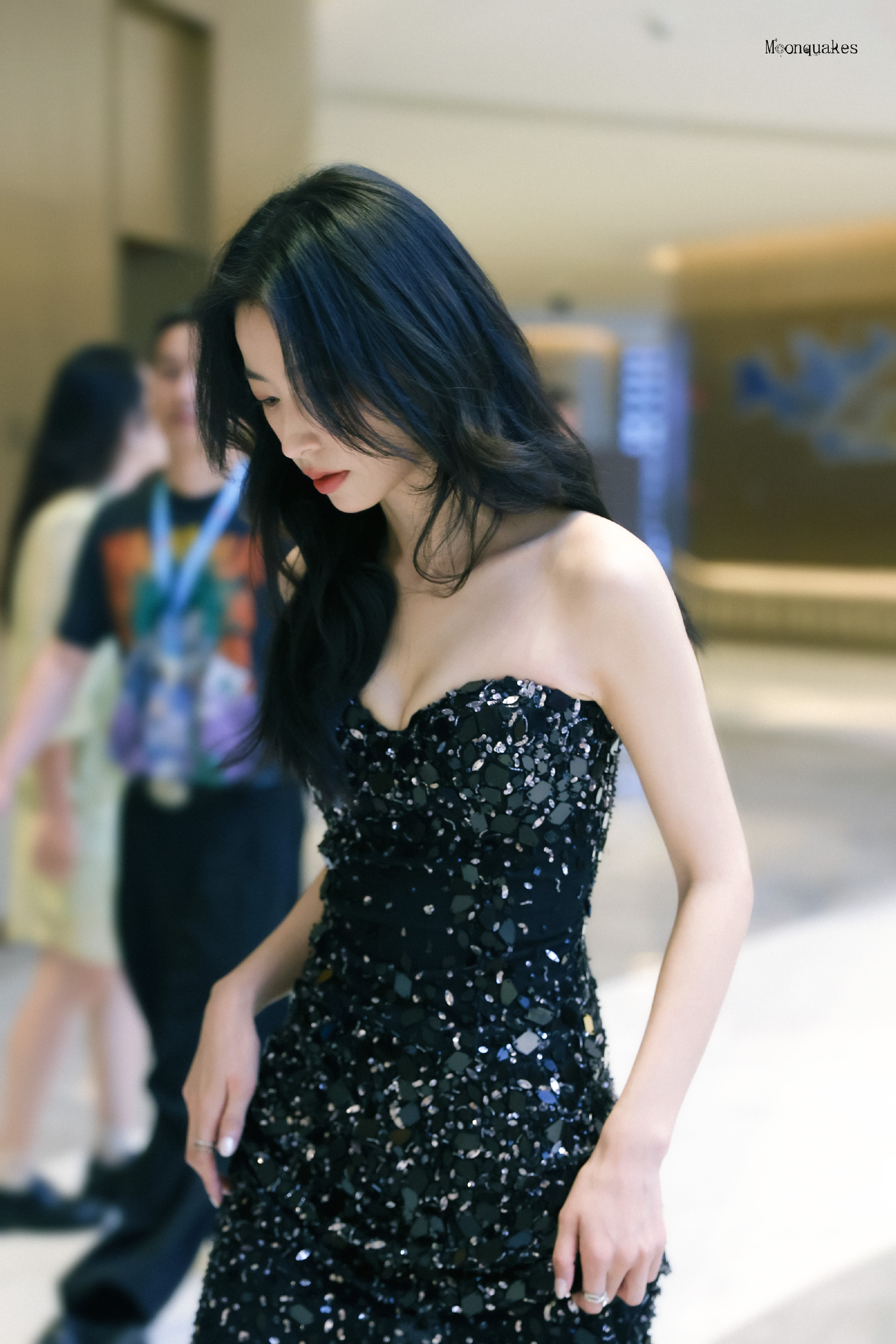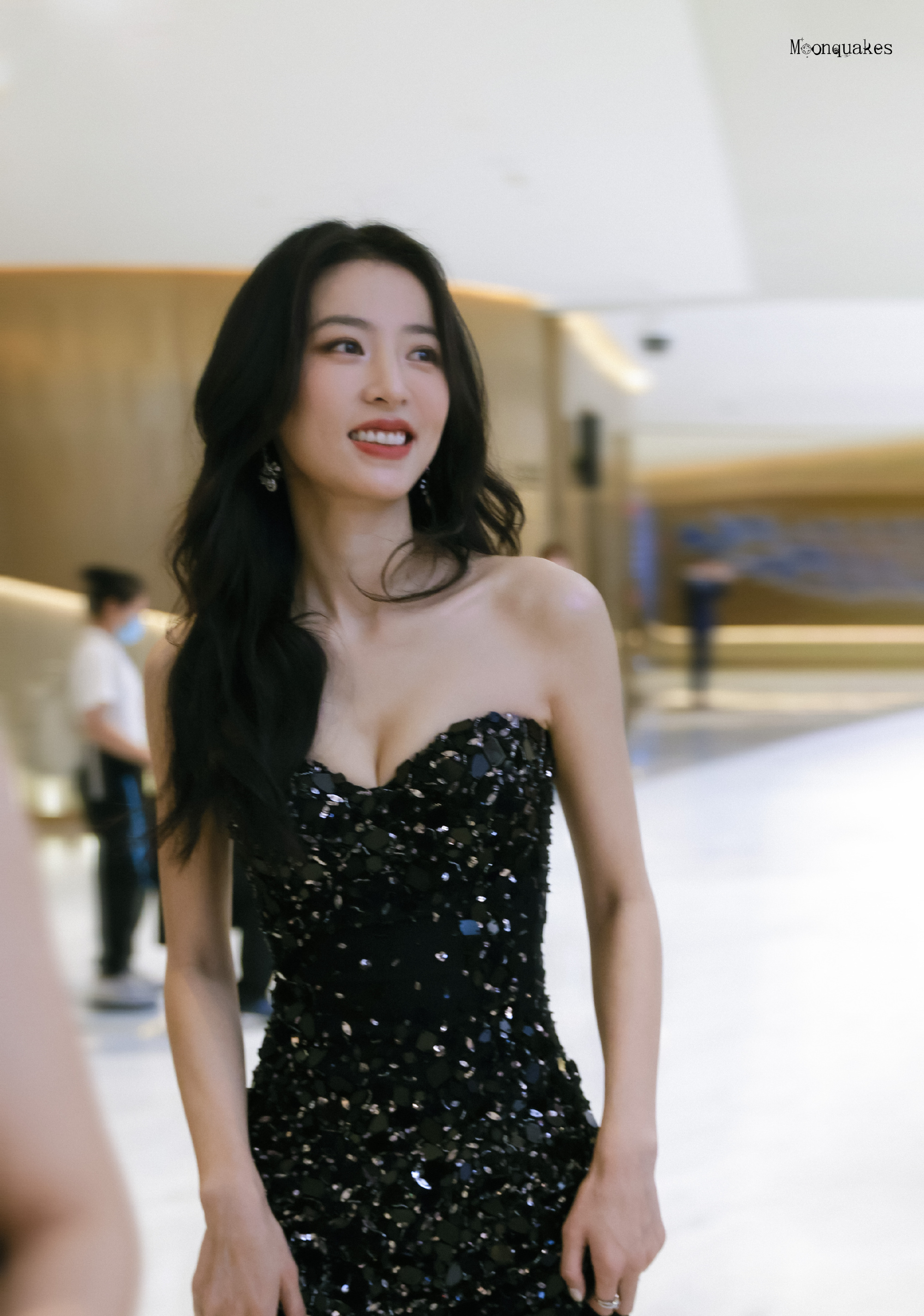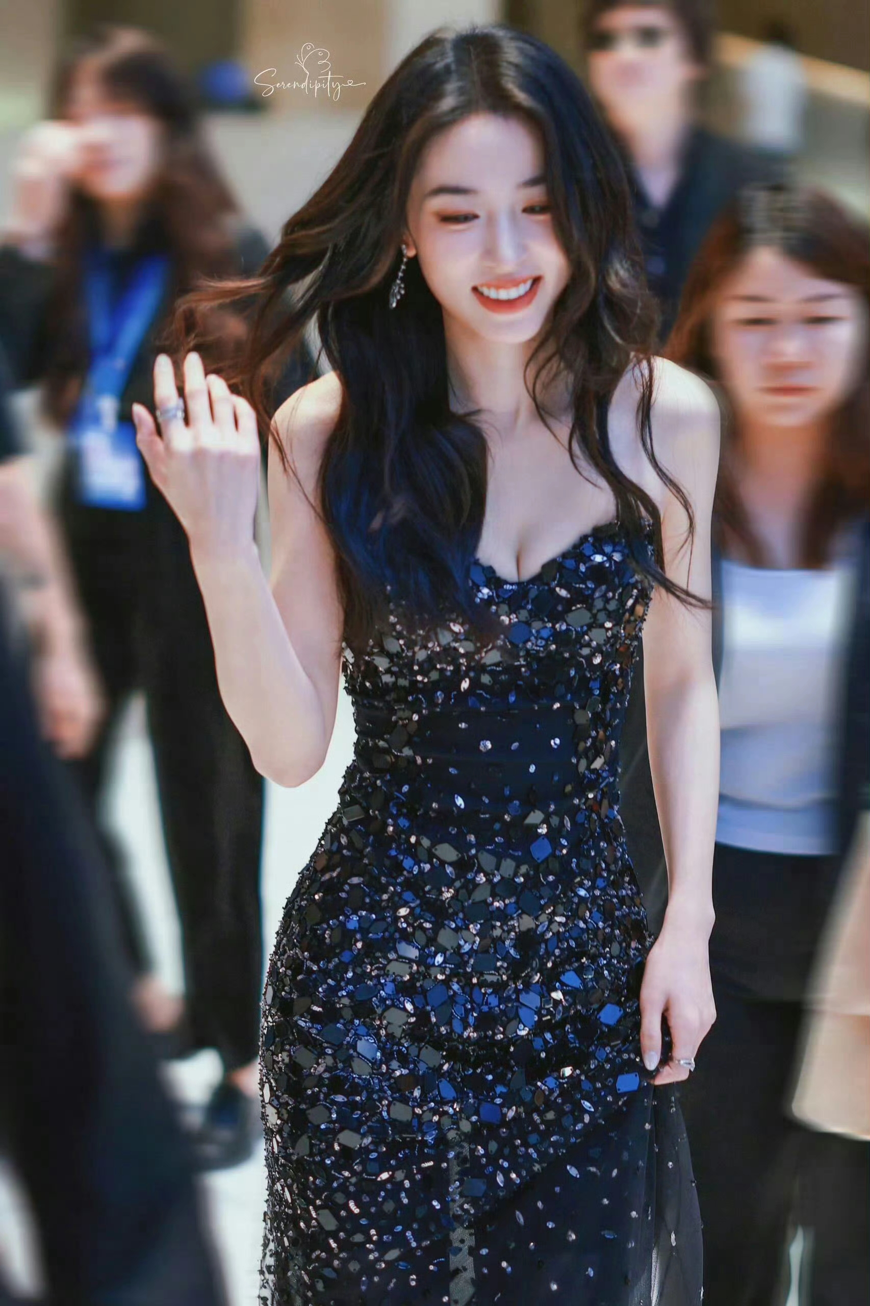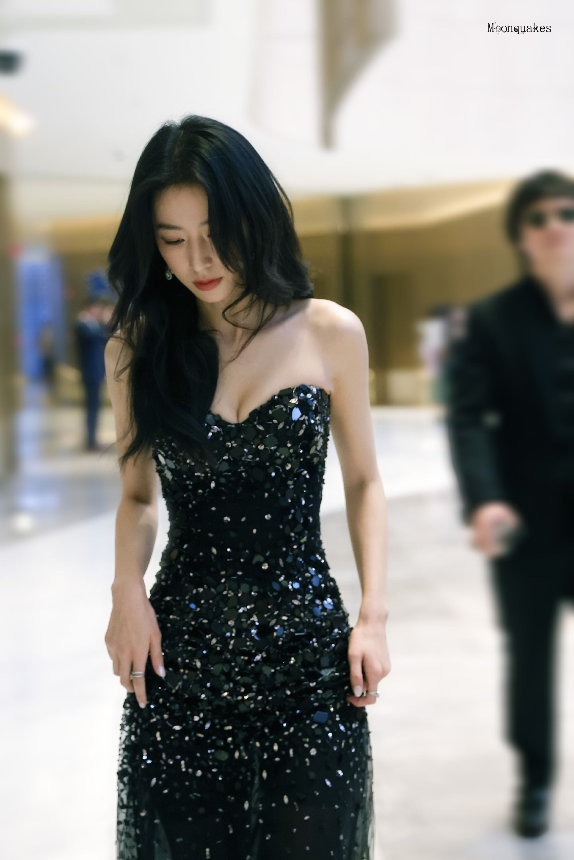裙身满布的亮片如星子洒落,在光影里折射出璀璨光泽,为造型添上华丽氛围。贴合身形的剪裁更将她纤细的腰肢、流畅优美的身体曲线完美勾勒,好身材尽显无遗。