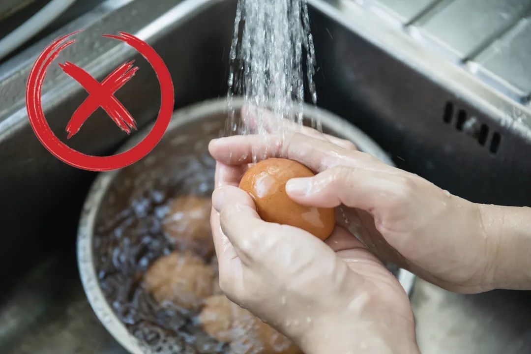 如果用冷水冲洗,容易使鸡蛋内部冷缩形成真空,反而使外壳上的细菌“被压进”鸡蛋内部。