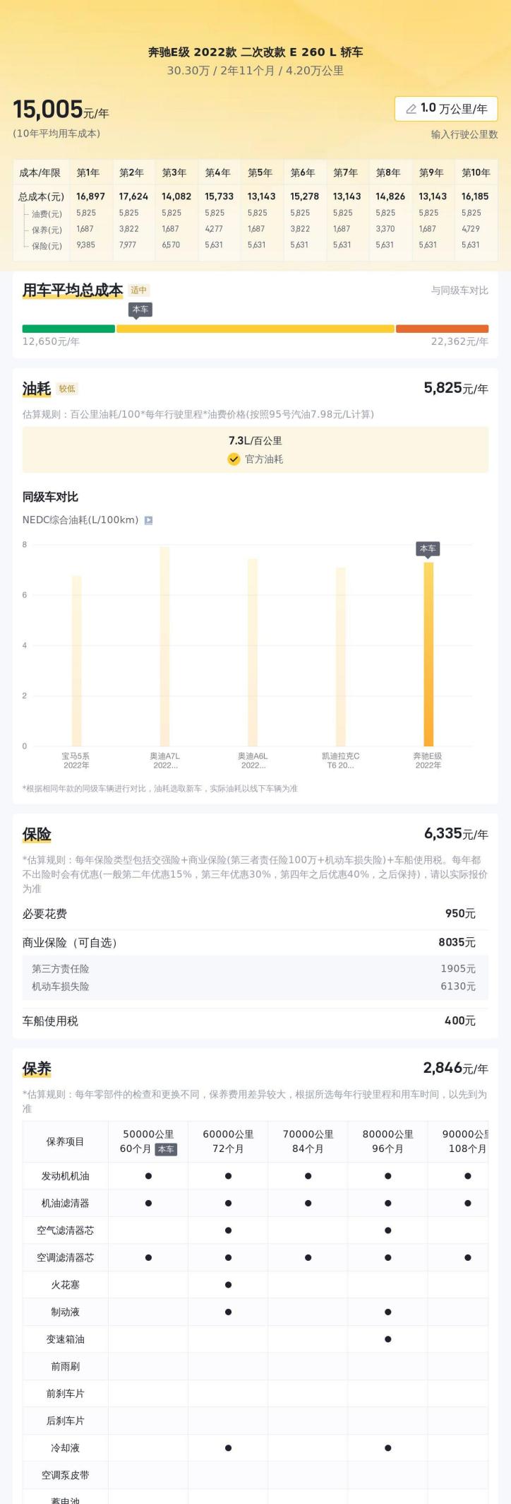 说到成本,就不得不提二手车的用车成本。虽然二手车的购车价格相对较低,但其后期的用车成本并不一定低。除了常规的保养费用外,还需要考虑维修费用、保险费用等。根据懂车帝的数据,这辆E 260 L的10年平均用车成本约为15,179元/年。这个数字仅供参考,实际的用车成本会受到多种因素的影响,例如驾驶习惯、路况、保养频率等。因此,在购买二手车之前,需要做好充分的预算,避免后期用车成本超出预期。