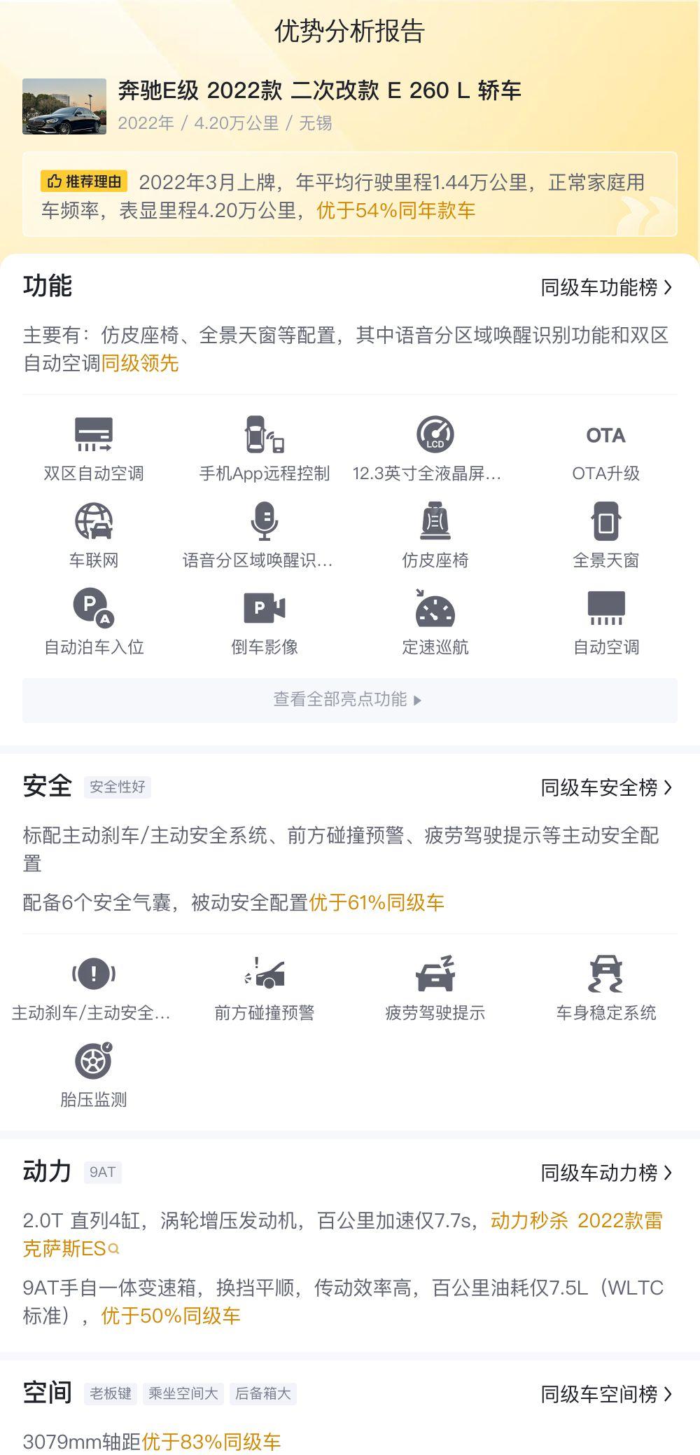 此外,购买二手车还需要关注市场行情。目前,同款E 260 L的二手车价格大致在26.05万至31.99万之间,30.3万的报价处于中等水平。在购买之前,可以多比较几家车商,了解市场行情,争取拿到更优惠的价格。