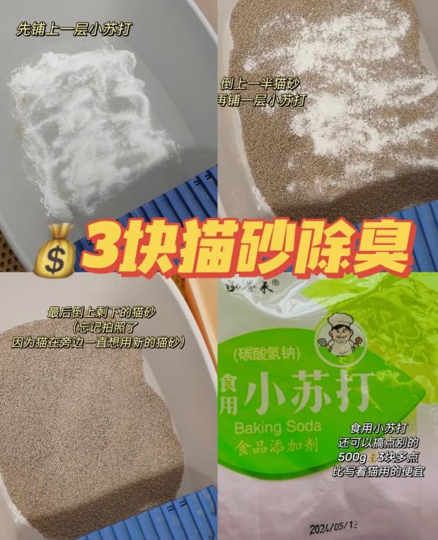 猫咪的猫砂盆臭的话,也可以用小苏打解决。