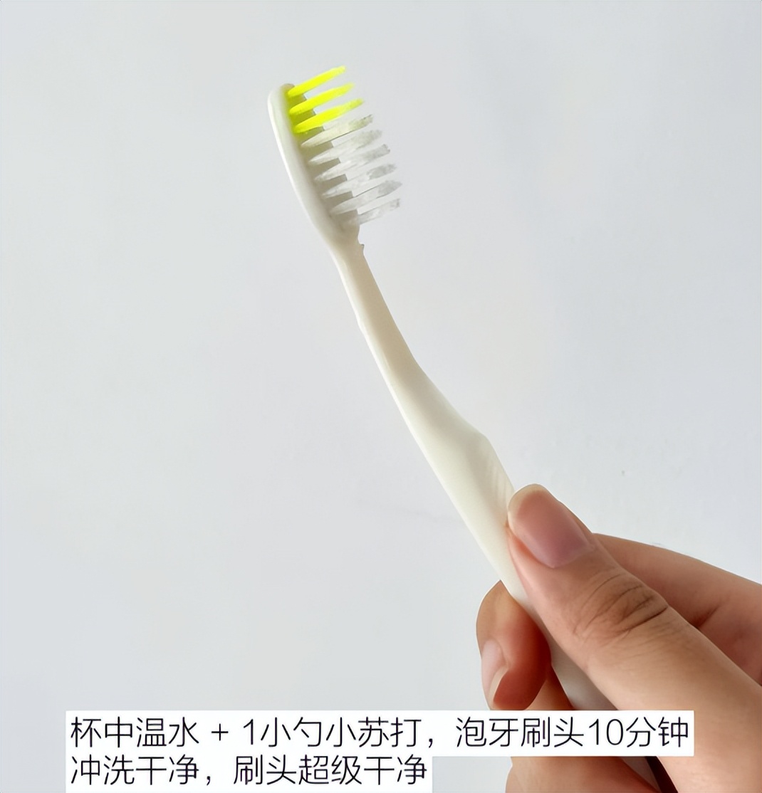 准备一杯温水,在温水里面倒入一勺小苏打,把牙刷放进去泡10分钟,刷头超级干净。