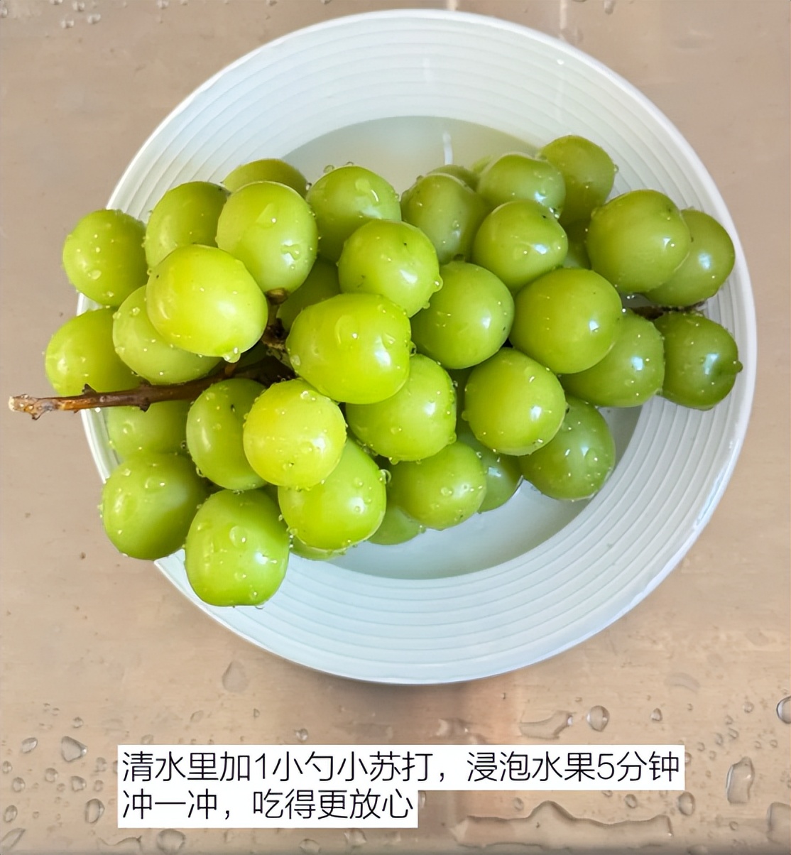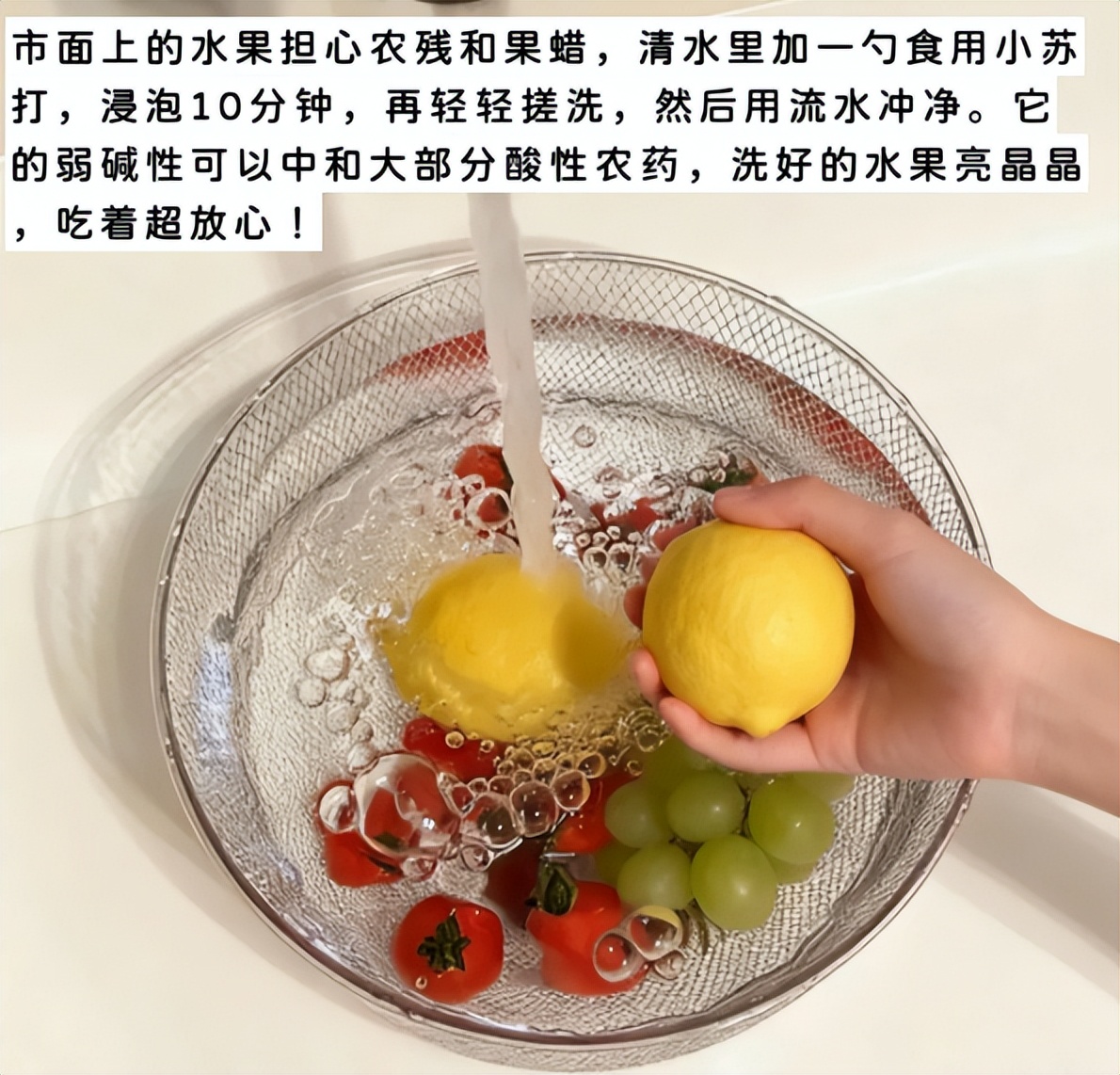 想要把水果洗干净,在清水里面倒入一勺小苏打,然后浸泡5分钟左右,再用清水冲一冲,吃着更放心。
