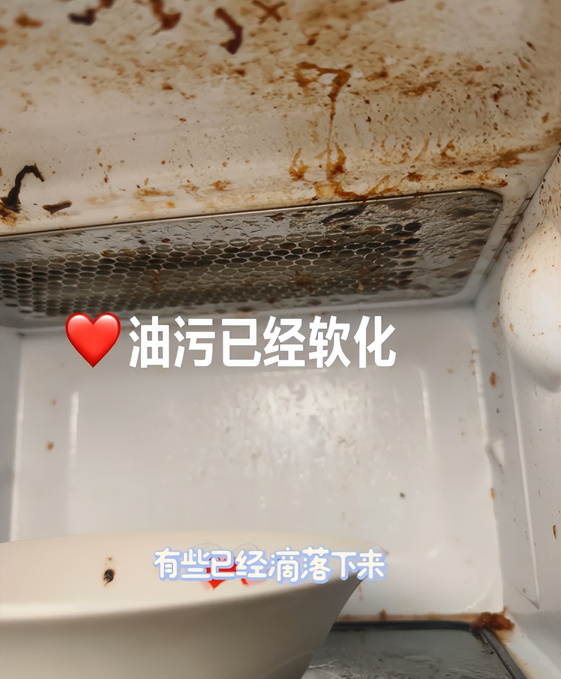 你会看到微波炉内壁的油污已经开始软化了,有些污垢已经开始往下滴落了。