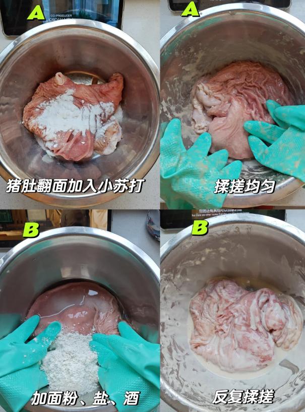 清洗的时候,猪肚翻面加入小苏打,揉搓均匀。