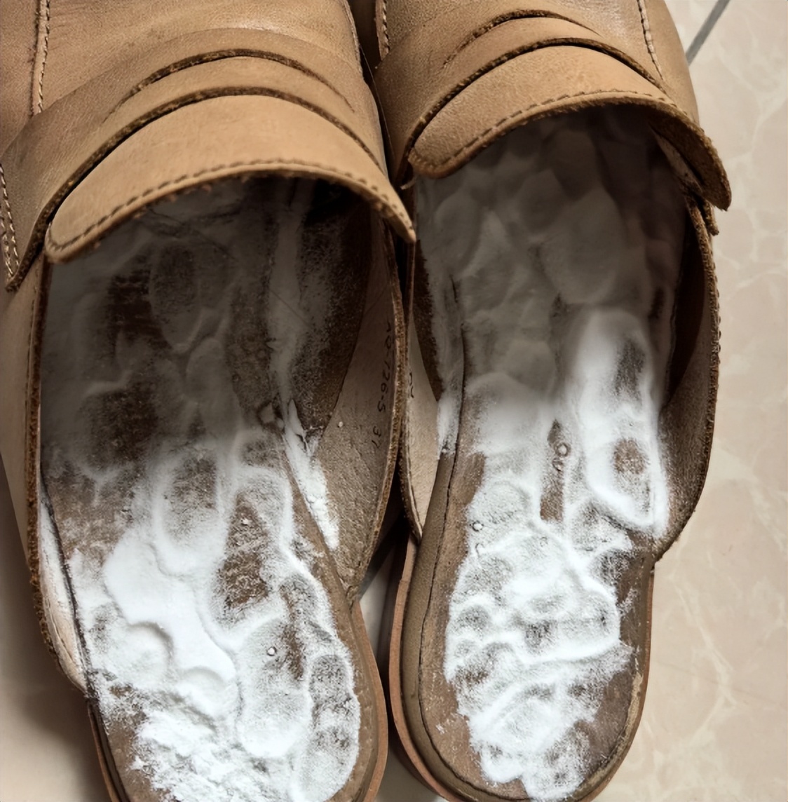 倒入之后,一晚上后,小苏打可以吸湿、吸异味,第二天一早,鞋子里面的臭味就消失了。