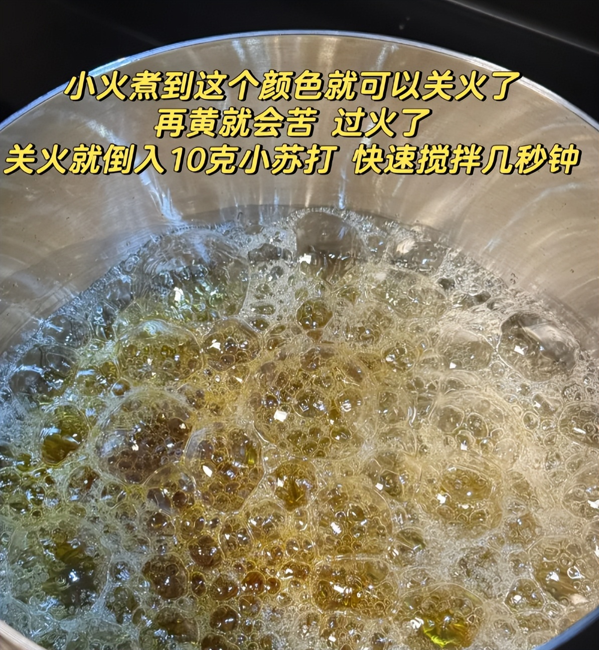 用小火熬糖浆,把糖浆熬成微微变黄的颜色就可以了,直接关火。
